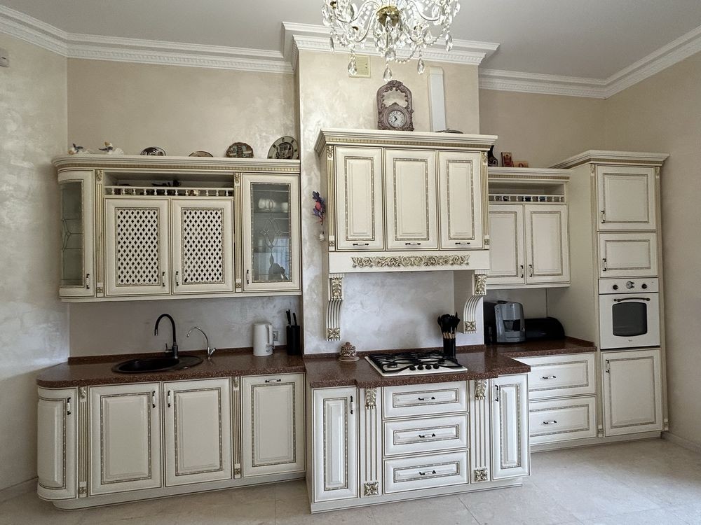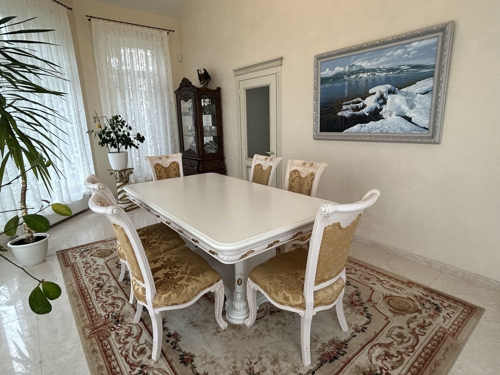 Меблі у світлих тонах з різьбленими деталями та золоченими елементами гармонійно поєднуються з інтер’єром.