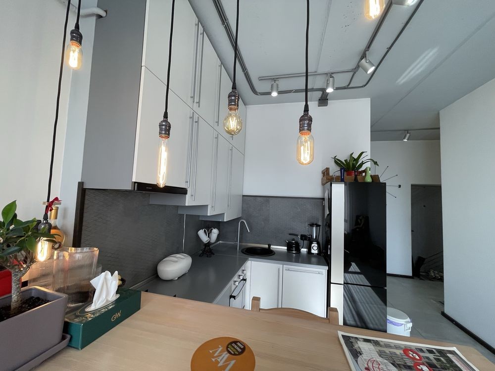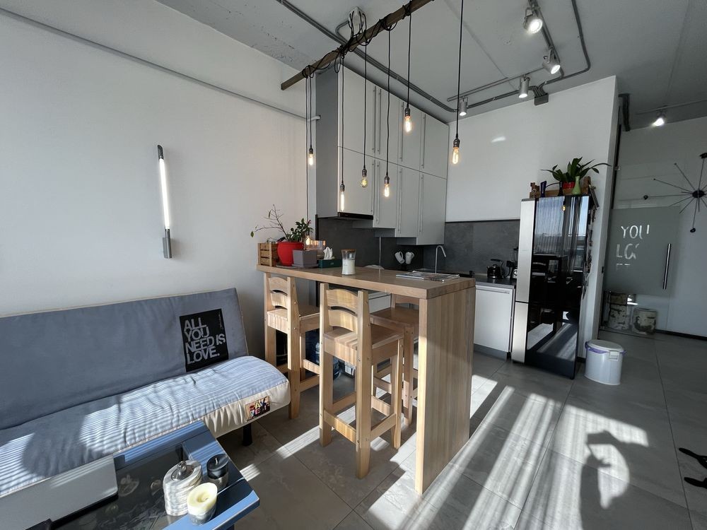 Квартира в дизайнерському стилі лофт. Зроблена для себе і з дуже якісних дорогих матеріалів та техніки. Є окрема гардеробна. Кімната в повній комплектації. Кухня вітальня з вбудованими меблями та технікою. Гостьовий диван з зоною ТВ. Індивідуальне газове опалення та лічильники.