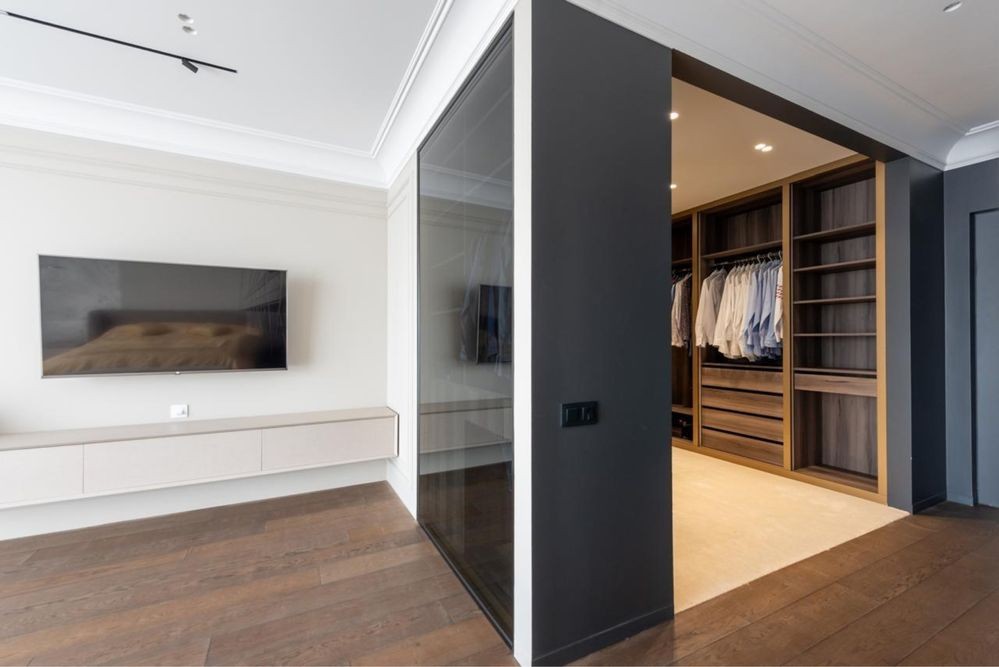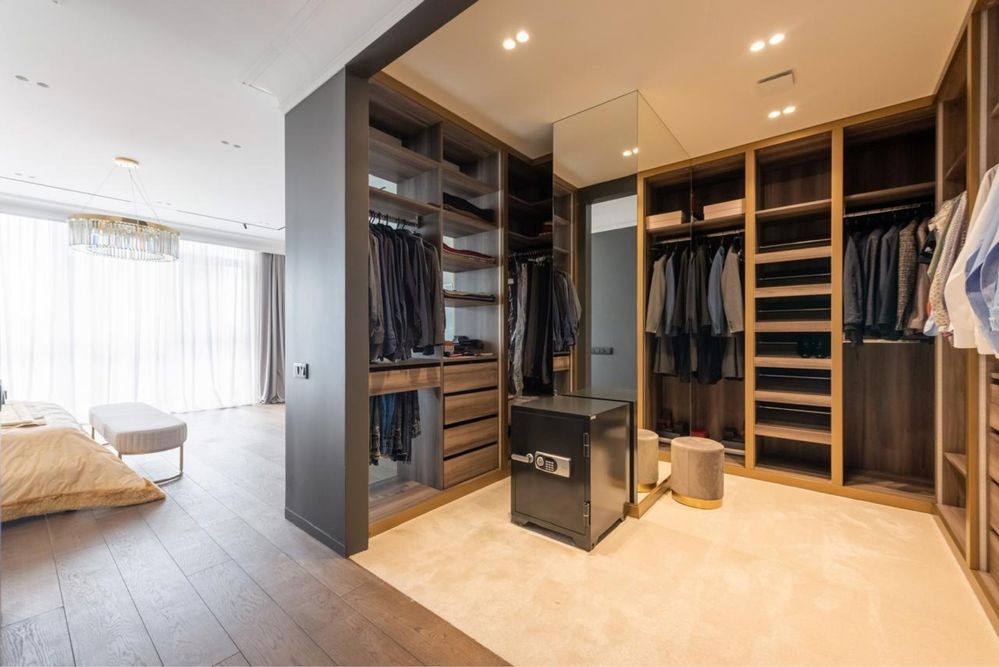Функціональне зонування включає: велику кухню, поєднану з вітальнею; master bedroom із власною розкішною гардеробною кімнатою та санвузлом; дві додаткові спальні (дитяча, гостьова), кабінет, додаткову гардеробну. У квартирі три санвузли, пральна кімната та просторий передпокій.