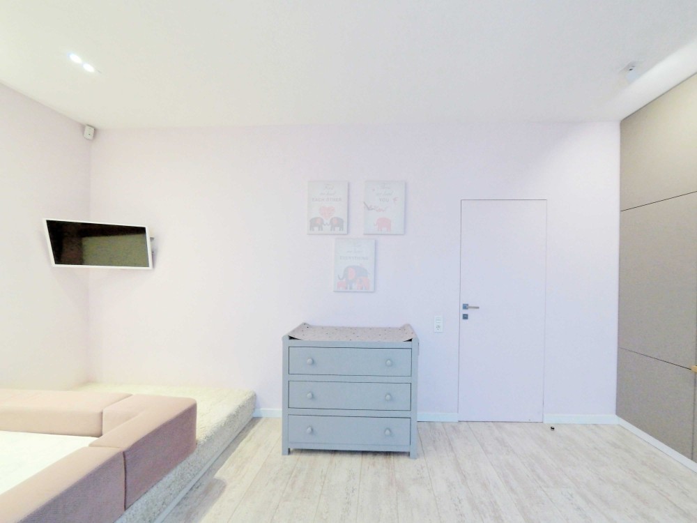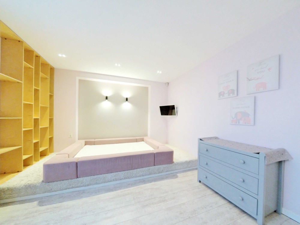 Велика вітальня з каміном та домашнім кінотеатром, велика кухня з усією необхідною сучасною побутовою технікою, обідній стіл на 12 персон, мастер спальня зі своєю гардеробною і панорамним видом на місто Київ, дитяча з робочим місцем, 2 санвузли з ванною і душкабіною, балкон, велика гардеробна в коридорі, пральна кімната.