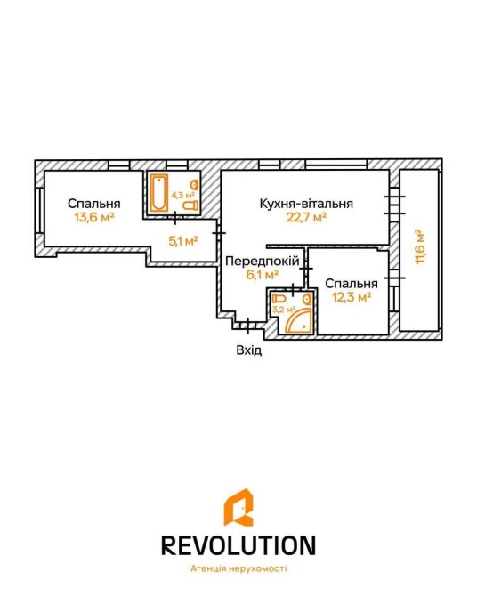 Кількість кімнат: 2 кімнати+ кухня-вітальня