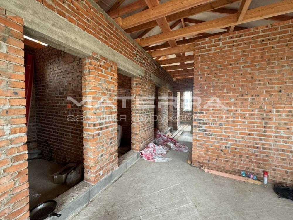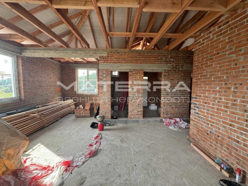Будинок на завершальному етапі, побудований з цегли, утеплений 150 мм пінопласт.