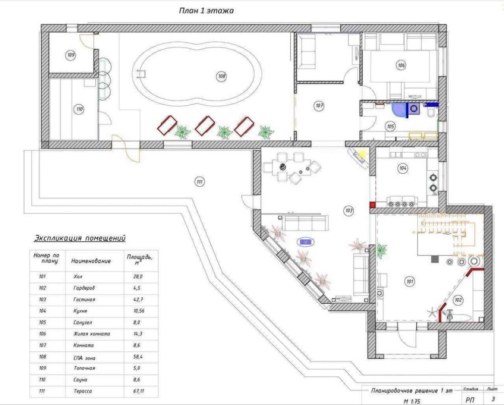 - На першому поверсі розміщенні такі кімнаті: Передпокій; Гардероб; Столова та вітальня з каміном; Кухня; Гостьова кімната; Кімната для персоналу; Санвузол; Басейн