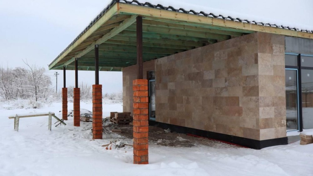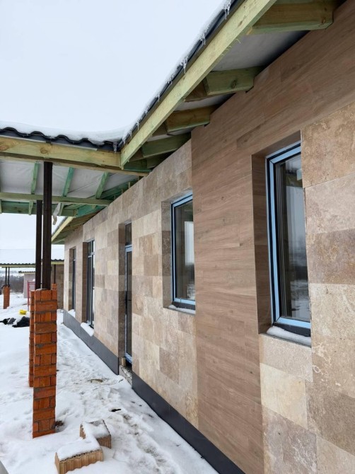 - Фасад – Травертин в поєднанні з керамогранітною плиткою (130-167м2) Короїд плитка (94м2).