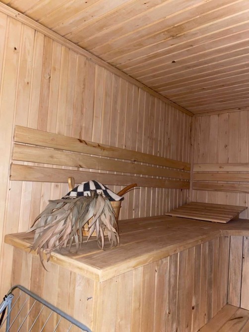 1-й поверх: Гостьова кімната, великий санвузол з ванною та душовою кабіною, кладова, туалет, велика сауна, невеликий холл з піаніно і окрема літня кухня.