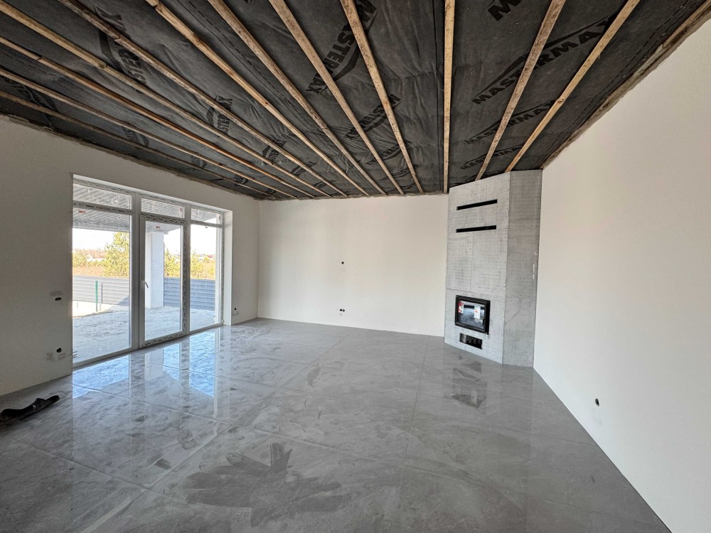 Комплектація: чистова штукатурка стін, розведена електрика та сантехніка, водяна тепла підлога по всій площі, утеплення стелі 20 см мінвати, встановлений камін.