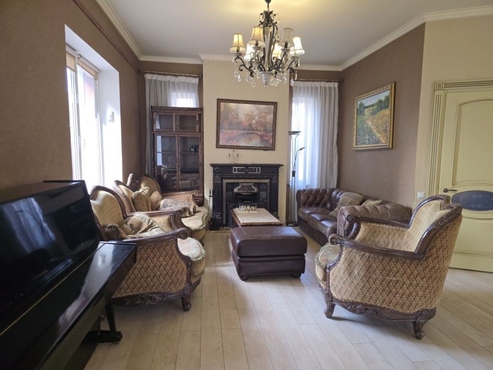 Велика гостьова кімната з каміном та якісними меблями, фортепіано .