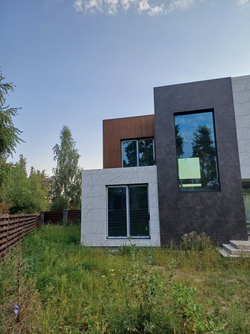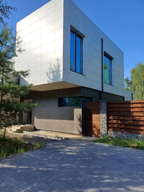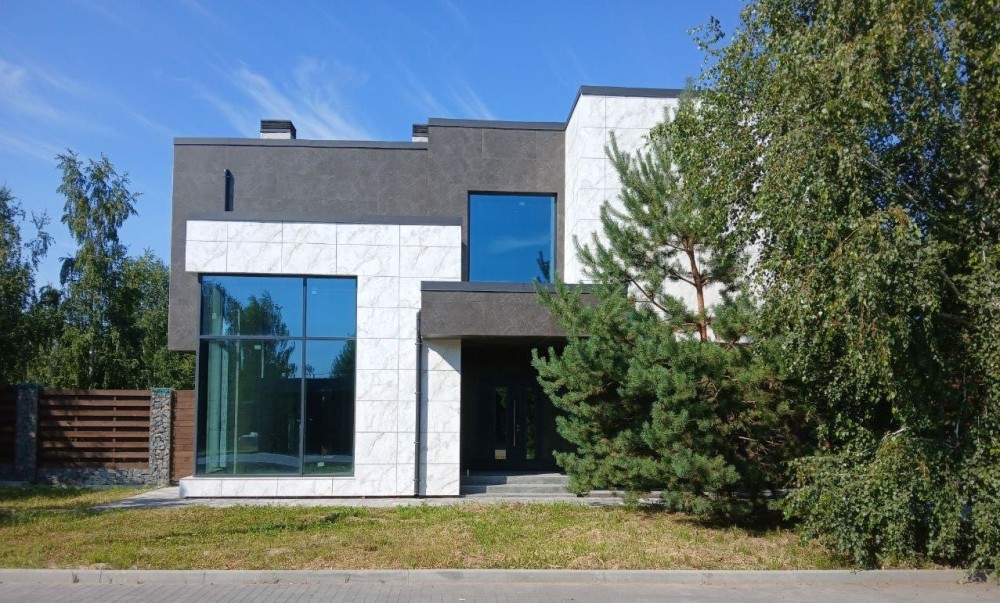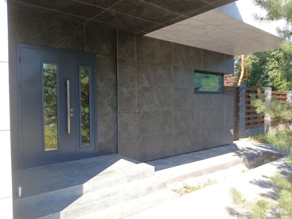 Будинок має вентильований фасад з плитки, що має високі теплоізоляційні якості, дуже стильно виглядає та простий в обслуговуванні.