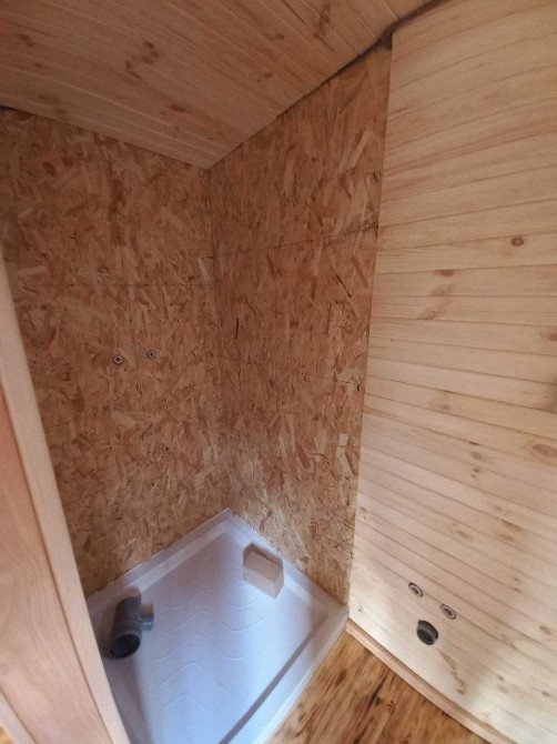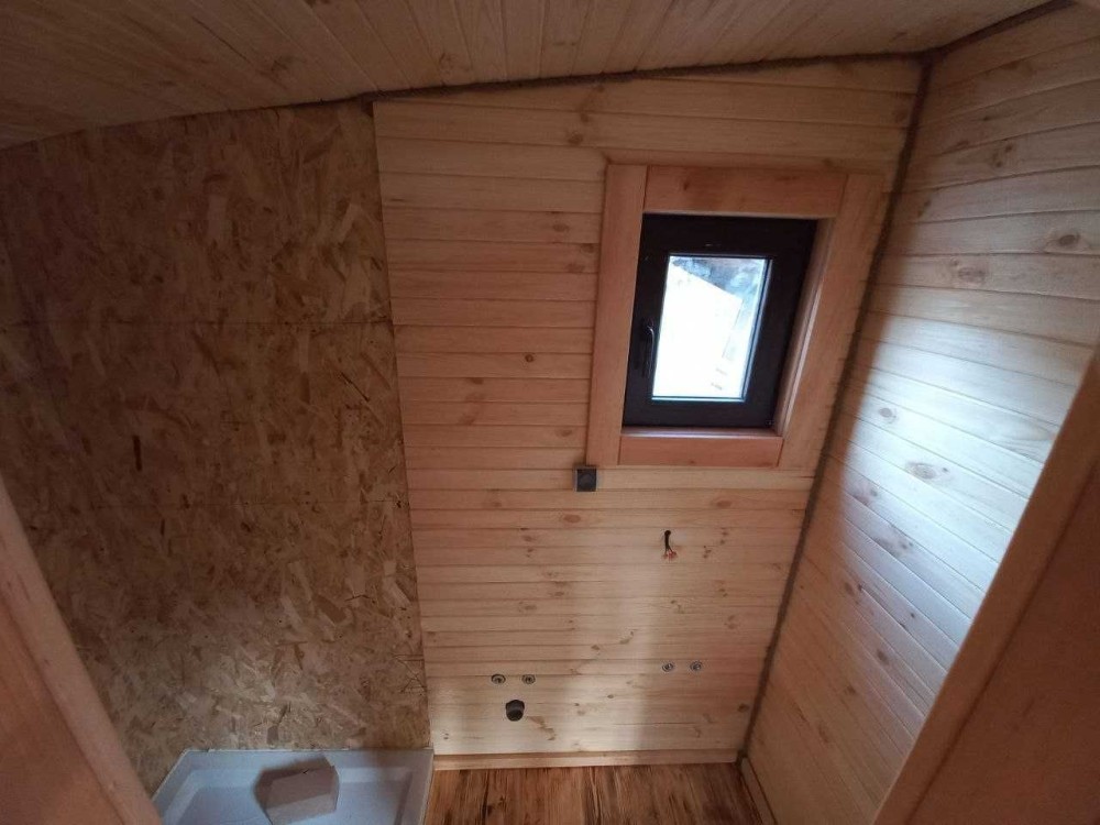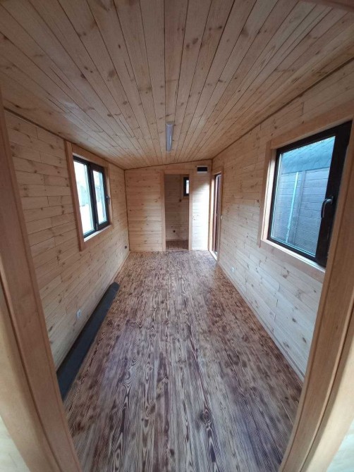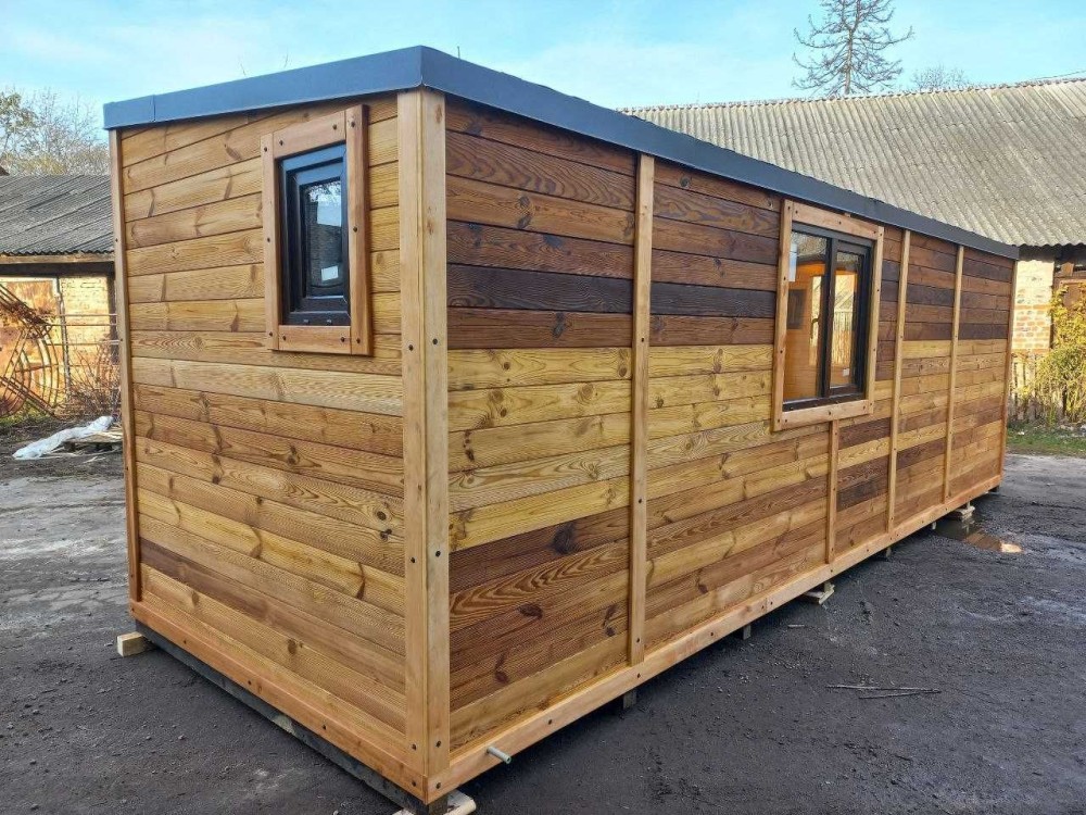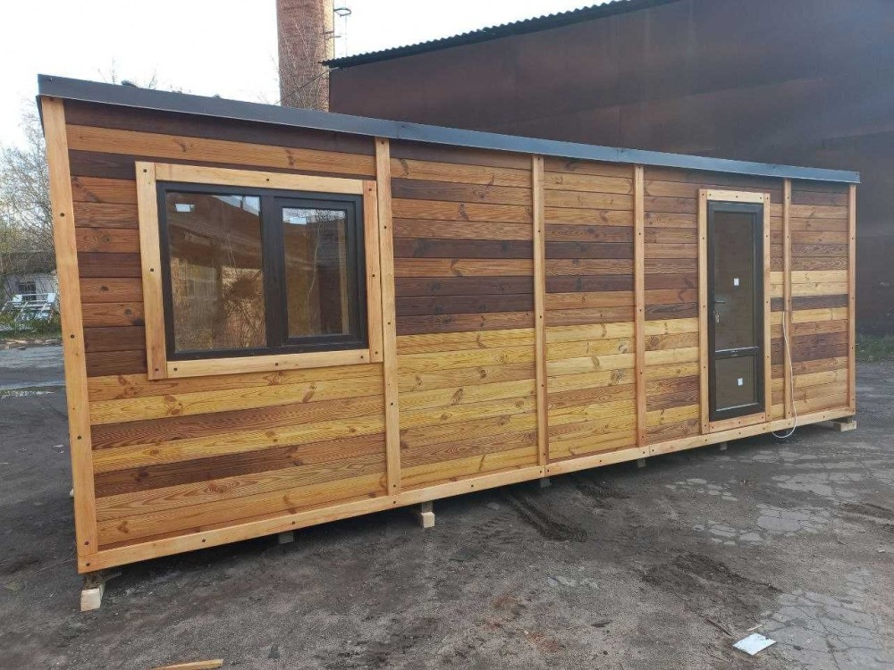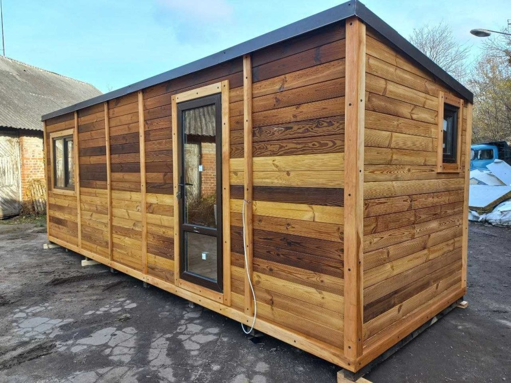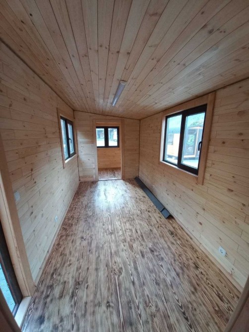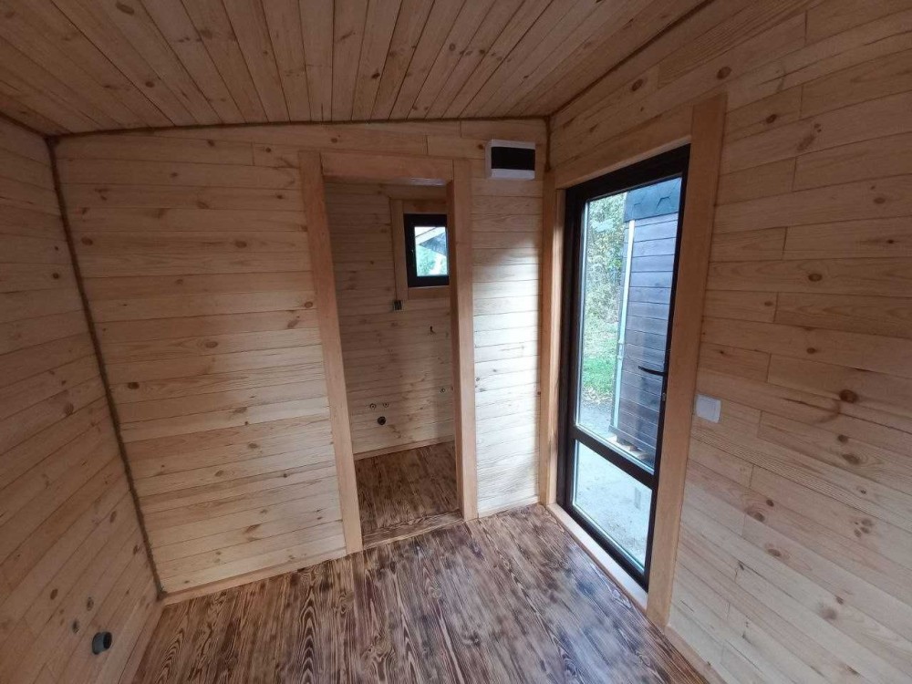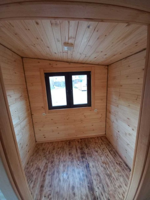 В цьому оголошені представлений будинок в розмірі 7м*2,4м. Він виготовлений по каркасній технології з фасадом з термо модифікованої сосни + паро- гідроізоляція + мінеральна вата 100мм + внутрішнє оздоблення натуральна соснова вагонка. На підлозі - також дошка підлоги з термо сосни.