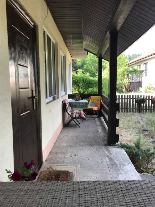 При вході в будинок зручна тераса. В будинку великий просторий коридор, який з'єднує всі кімнати. В коридорі є трюмо, комод, проведений кабельний інтернет, окреме приміщення під гардероб. Меньшу кімнату можна трансформувати в дитячу, в робочий кабінет або спальню. Велика кухня. В наявності посуд, стіл, стільці, холодильник, телевізор, пилосос. Спальня з просторою 2-х спальною кроваттю, шафою для особистих речей, м'яким кріслом, тумбочками і нічниками. Санвузол суміжний, гарно освітлений за рахунок великого вікна. Є ванна, бойлер, пральна машина. Опалення електричне. Свердловина.  Система фільтрації та очистки води. Проводяться роботи та готується місце для генератора, окремо від будинку. Готуємось до зими влітку.