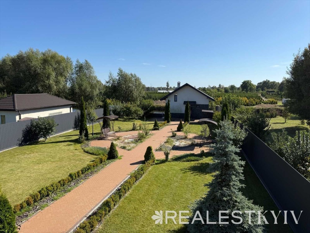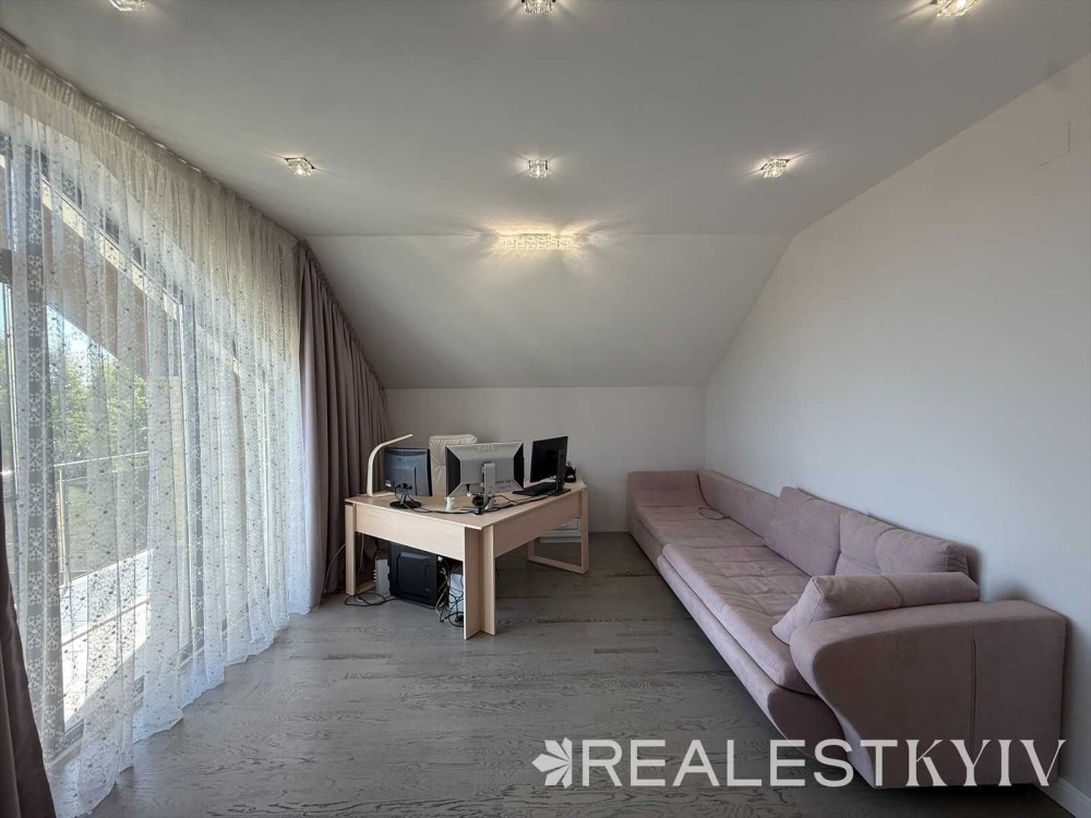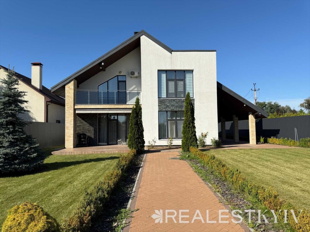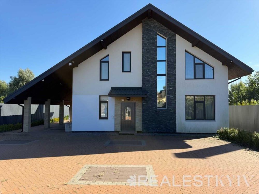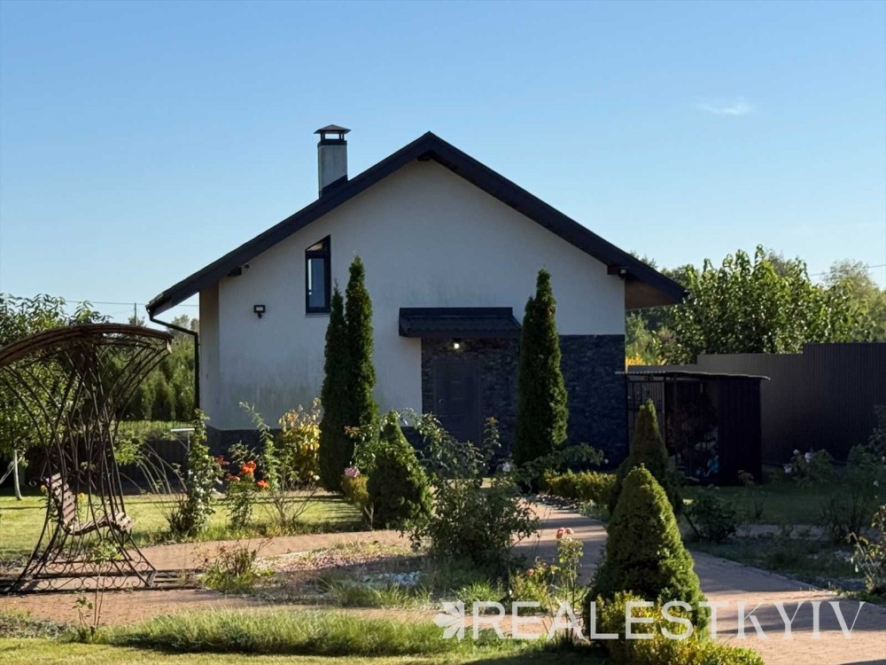 Продається новий індивідуальний житловий будинок котеджного типу загальною площею 131 м.кв. під чистове оздоблення, розташований в селі Крячки Фастівського (колишнього Васильківського) району Київської області на території нового житлового масиву із сучасною котеджною забудовою, що перебуває на відстані 20 км від станції метро «Теремки» міста Києва та за 1,5 км від міста Васильків. Житловий будинок складається з першого та мансардного поверхів. Загальна площа будинку із допоміжними спорудами становить 173,1 м.кв., з яких: а) площа будинку ‒ 131,0 м.кв., у тому числі житлова (основна) ‒ 94,1 м.кв. та допоміжна (підсобна) ‒ 39,6 м.кв.; б) площа тераси – 23,1 м.кв.; в) площа трьох балконів – 13,4 м.кв. (5,8 + 4,9 +2,7 м.кв.); площа ґанку – 5,6 м.кв. Котедж вміщує в собі 5 (п’ять) доволі просторих кімнат, 2 (два) санвузли (на кожному із поверхів), 1 (одне) технічне приміщення (котельня або бойлерна), 2 (два) коридори, 1 (одну) вітальню із виділеною еркером обідньою зоною, що поєднана з кухнею. Із вітальні є окремий вихід на велику терасу, з якої відкривається затишний вигляд на внутрішній двір. Кожна з трьох мансардних кімнат має окремий вихід на балкон. Над усією площею мансардного поверху розташоване містке горищне приміщення. Будинок приєднаний до електропостачання потужністю ‒ 12кВт (3 окремих фази). Має свердловину глибиною 55 метрів із фактичним дебітом (спроможною потужністю) ‒ 2,5 м.куб./год. та каналізацію септик з переливом на 11 м.куб. На усій площі першого (крім житлової кімнати) та у санвузлі мансардного поверхів встановлена система водяної теплої підлоги фірми «Rehau». По котеджу розведені: опалення, водопостачання і каналізація. В будинку передбачена можливість встановлення камінної топки, а також приєднання котеджу до газорозподільної мережі та всесвітньої мережі Інтернет. Індивідуальний житловий будинок розташований на земельній ділянці площею 0,075га з цільовим призначенням – (02.01) для будівництва і обслуговування житлового будинку, господарських будівель і споруд (присадибна ділянка). Під житловою забудовою перебуває 0,0115га земельної ділянки, решта 0,0635га займає просторий двір. Кадастровий номер земельної ділянки: 3221487004:03:006:0328. Земельна ділянка огороджена парканом із монолітного фундаменту, що опорядковане металевим штахетом із обох боків та металевим профілем з тильної та фасадної сторін. Заїзд у двір має відкатні ворота. На території двору (перед будинком) облаштоване загальне паркомісце на 2 (два) автомобіля, решта двору засіяне газонною травою. Котедж побудований з якісних матеріалів за проектом європейського архітектурного бюро. Так, фундамент, перекриття та міжповерхові сходи ‒ монолітні. Стіни будинку збудовані з газоблоку AEROC D500 (товщиною 300мм), що утеплений пінопластом 100мм. Внутрішні міжкімнатні перегородки виконані із цегли. Дах ‒ металочерепиця фірми «Ruukki», що утеплений мінераловатними плитами загальною товщиною 200мм. Вікна вироблені з профілю фірми «Rehau» серії EVRO 70. Фасад котеджу покритий акриловою штукатуркою. Будинок за усім периметром має вимощення шириною 0,9 метри, що облаштоване фігурними елементами мощення (ФЕМ). Зручне ергономічне планування будинку, а також наявність високих стель обох поверхів дає можливість відчувати себе вільно і затишно. Завдяки правильному утепленню зовнішніх стін будинку, у ньому прохолодно влітку та тепло вз