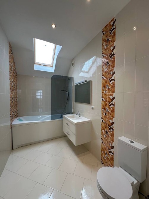 Продам новий будинок 2022 року на Нижньому ДНСі. Два поверхи плюс підвал і холодне горище. Газоблок Д-400 вкритий металочерепицею, обштукатурений і пофарбований, перекритий монолітним залізобетоном. Площа будинку 104 метри. Перший поверх: велика кухня 30 кв.м. з панорамним склінням і виходом на задній двір, передпокій, коридор, перший санвузол. Другий поверх: три житлові кімнати, другий санвузол, сходовий марш. У підвалі котельна, на горище розкладна драбина. Заведена вода зі свердловини 85 метрів, водовідведення в центральну каналізацію. Електроенергія 20 КВт. Змонтована система водяних теплих підлог і радіаторів, електричний котел на 10 КВт. По усьому будинку виконана розводка електрики. Стіни перетерті, металопластикові вікна з теплими скосами, в обох санвузлах розведена і змонтована сантехніка, укладений кахель, душова кабіна на першому і ванна на другому поверсі. На першому поверсі поли викладено плиткою, на другий закуплено і залишиться ламінат, також закуплені і залишаться вуличні світильники та деякі інші матеріали. Залізобетонні сходи на другий поверх викладені керамогранітом. Ділянка 2.5 сотки, обгороджена, відкатні автоматичні ворота. Двір вимощений тротуарною плиткою, змонтовано відведення стічних вод в дренажний колодязь. Залитий фундамент і колони під бесідку і барбекю. З вікон і бесідки відкривається чудовий панорамний краєвид на зелену зону річки Рось. Ціна: 160.000 у.о. Торг. Запрошуємо до співпраці продавців і орендодавців нерухомості. Агенція нерухомості пропонує повний перелік операцій з нерухомістю та супровідною документацією. Купівля-продаж, оренда, обмін житлових та комерційних об’єктів, земельних ділянок. Оцінка майна ринкова та для оподаткування. Технічні паспорти. Узаконення самочинного будівництва, добудови, перепланування. Початок будівництва та ввід в експлуатацію. Землевпорядні роботи: кадастровий номер, приватизація, розподіл, об’єднання, зміна призначення. Кредитування під заставу нерухомості. Безкоштовно приймаємо заявки від продавців та орендодавців. Гарантія конфіденційності. Юридичний супровід. м.Біла Церква Тел.(097)-879-80-99
