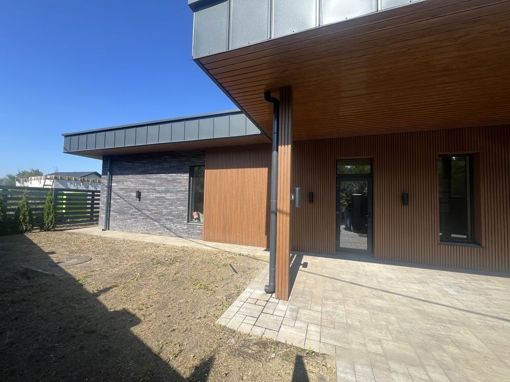 Фасад- клінкерна цегла, ДПК рейка (деревно-полімерний композит, обробка як у дерева не потрібна, стійкий до температурних перепадів)