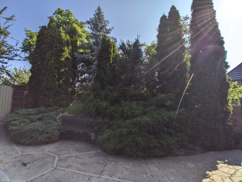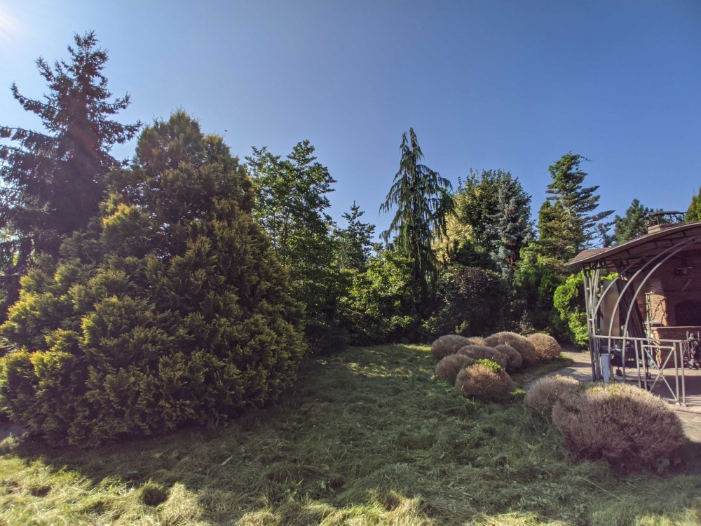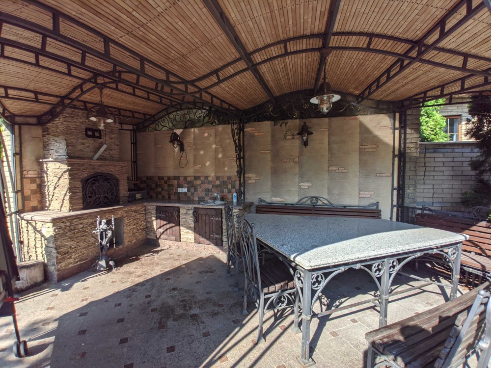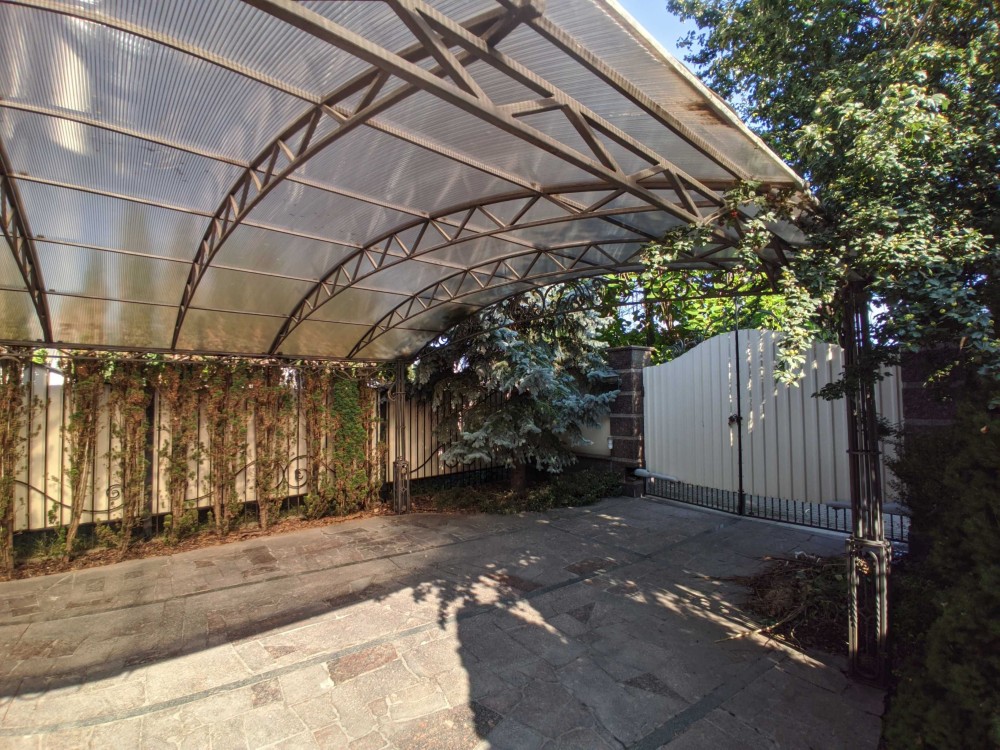 Земельна ділянка площею 11 соток, критий майданчик для паркінгу, вуличний басейн з підігрівом, декоративні рослини, фруктові дерева, садові меблі.
