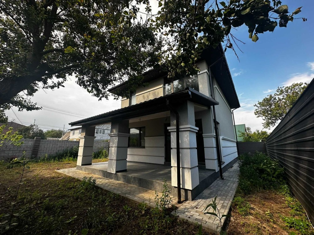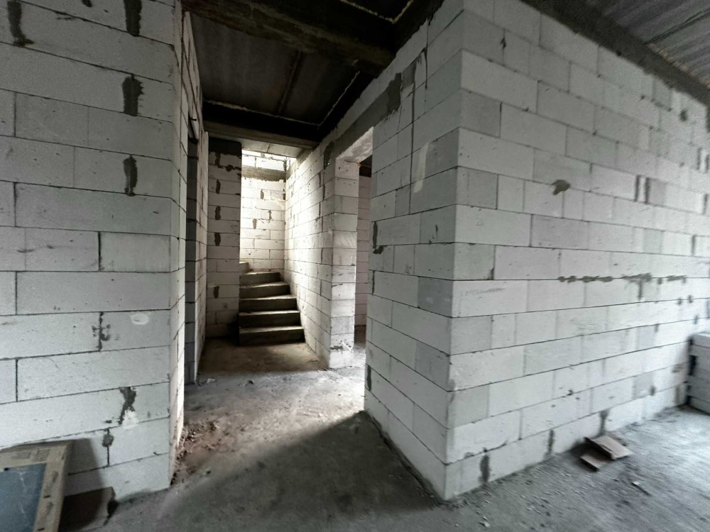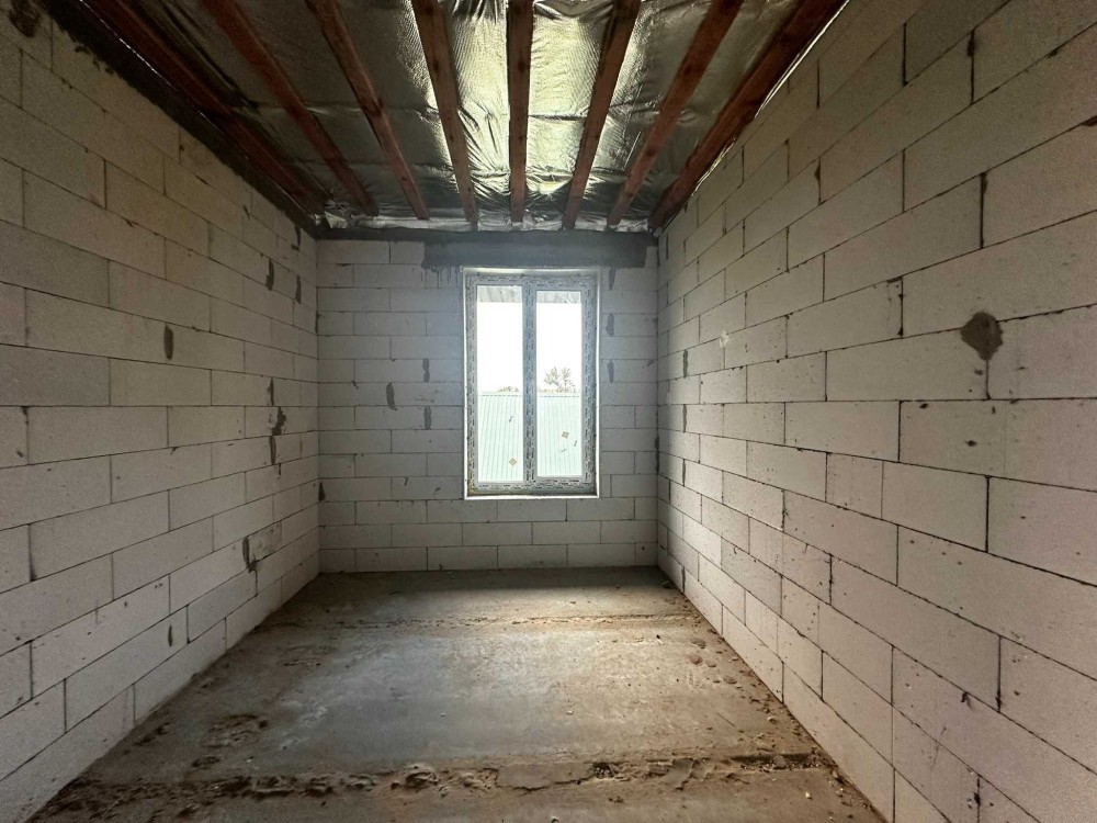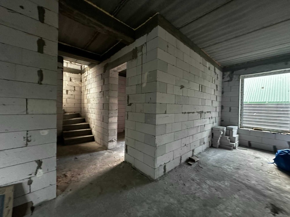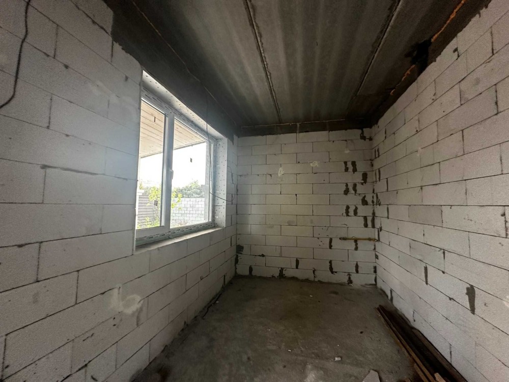 Площа будинку 120 кв.м., два поверхи, бетонні сходи. З першого поверху є вихід на криту терасу. В будинку 4 спальні, одна зі спалень господарська, кухня-вітальня, 2 санвузла, місце під кладову і гардероб.