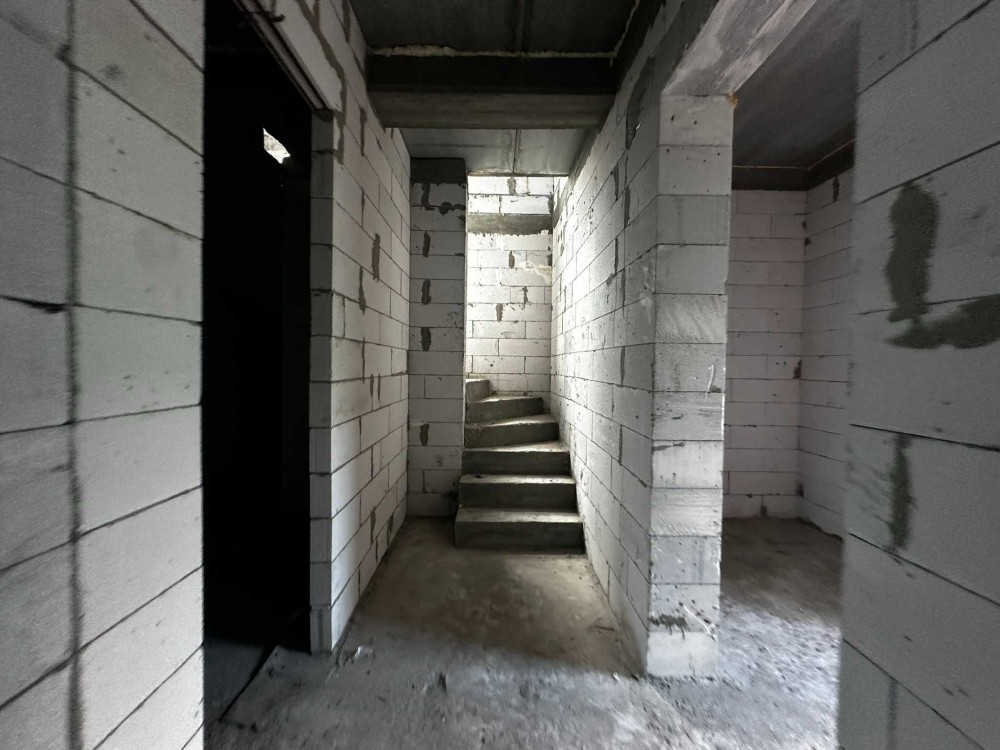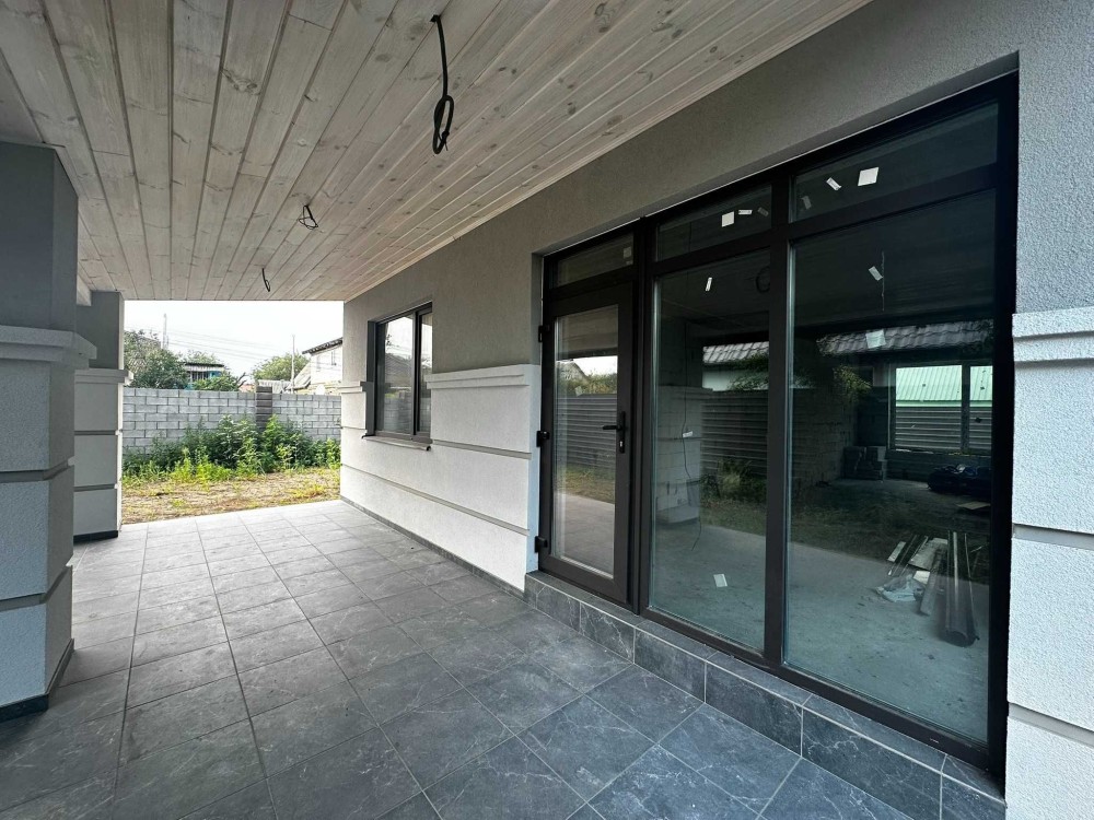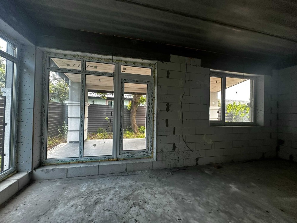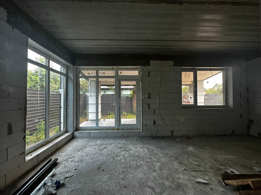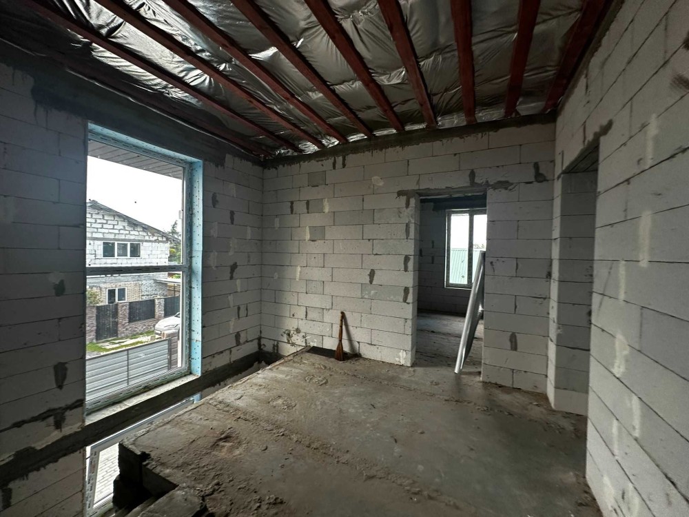 Площа будинку 120 кв.м., два поверхи, бетонні сходи. З першого поверху є вихід на криту терасу. В будинку 4 спальні, одна зі спалень господарська, кухня-вітальня, 2 санвузла, місце під кладову і гардероб.