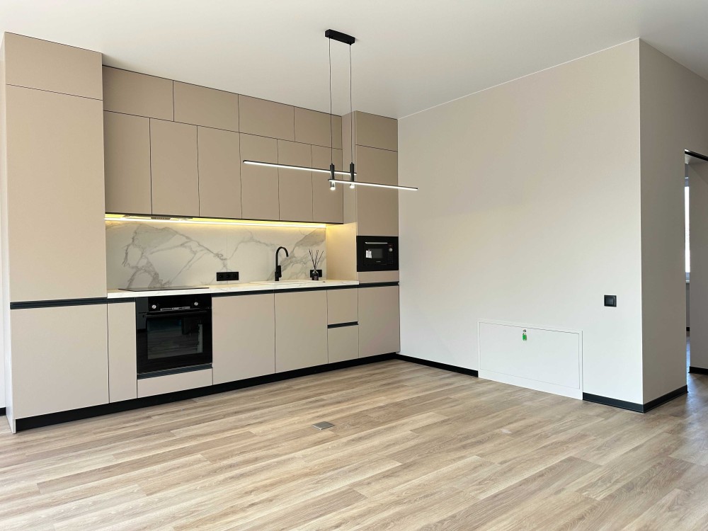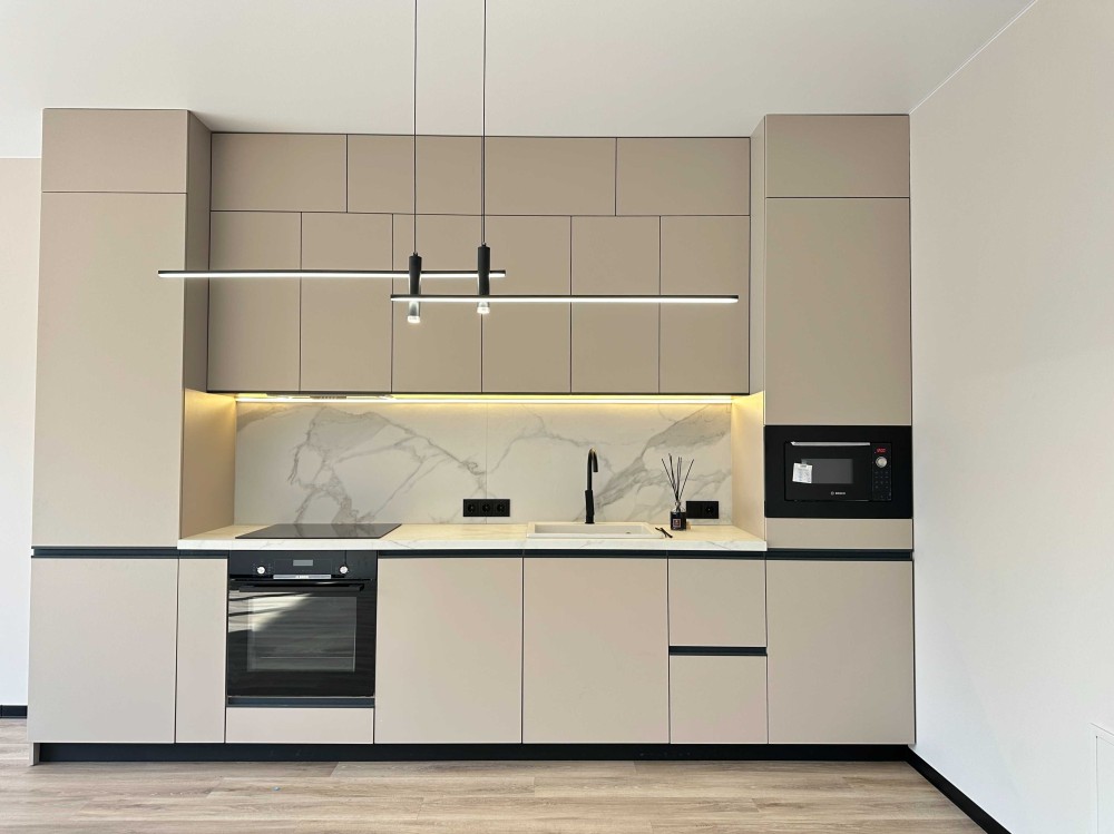Встановлено кухню з вбудованою технікою: мікрохвильова піч, духова шафа, індукційна варильна поверхня, посудомийна машина.