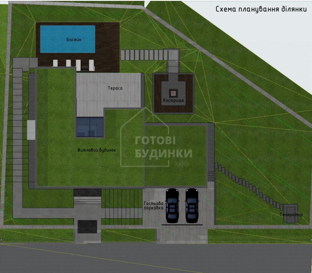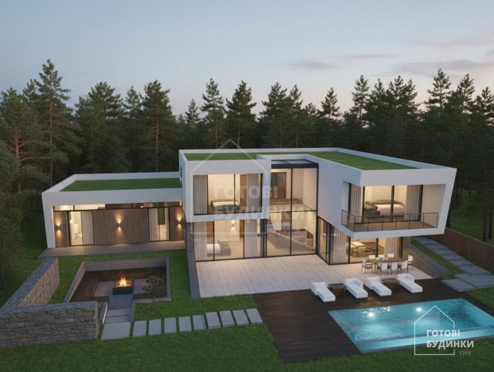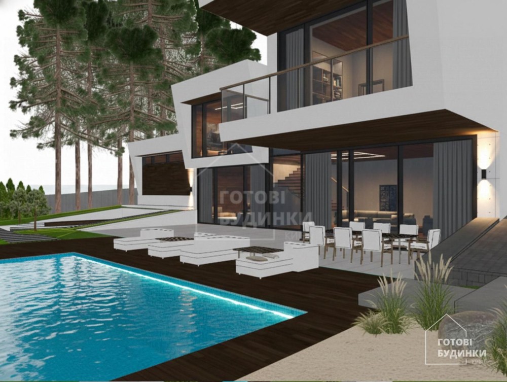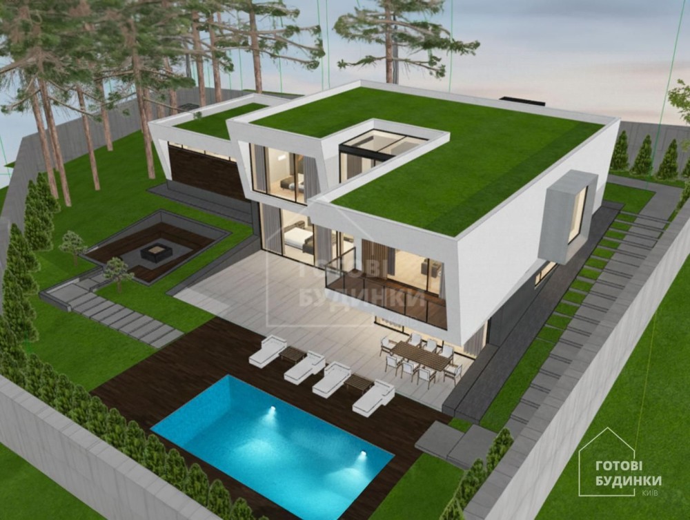 Готовий фасад будинку, вікна, вхідні двері, басейн, SPA, укриття, внутрішня штукатурка стін, рулонний газон, система автоматичного поливу, декоративні рослини, освітлення, відмостка території, автоматичні ворота, паркан..
