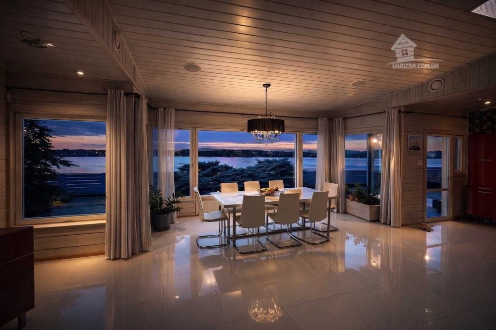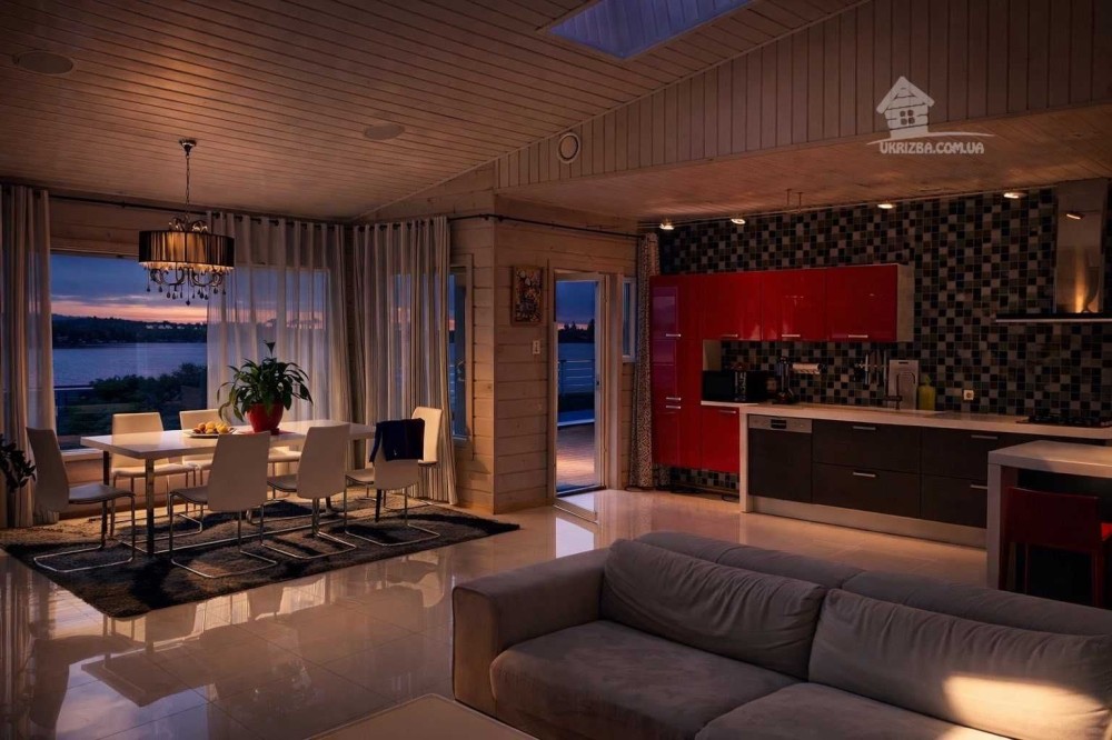 • велика кухня-студія з панорамними вікнами та видом на Дніпро