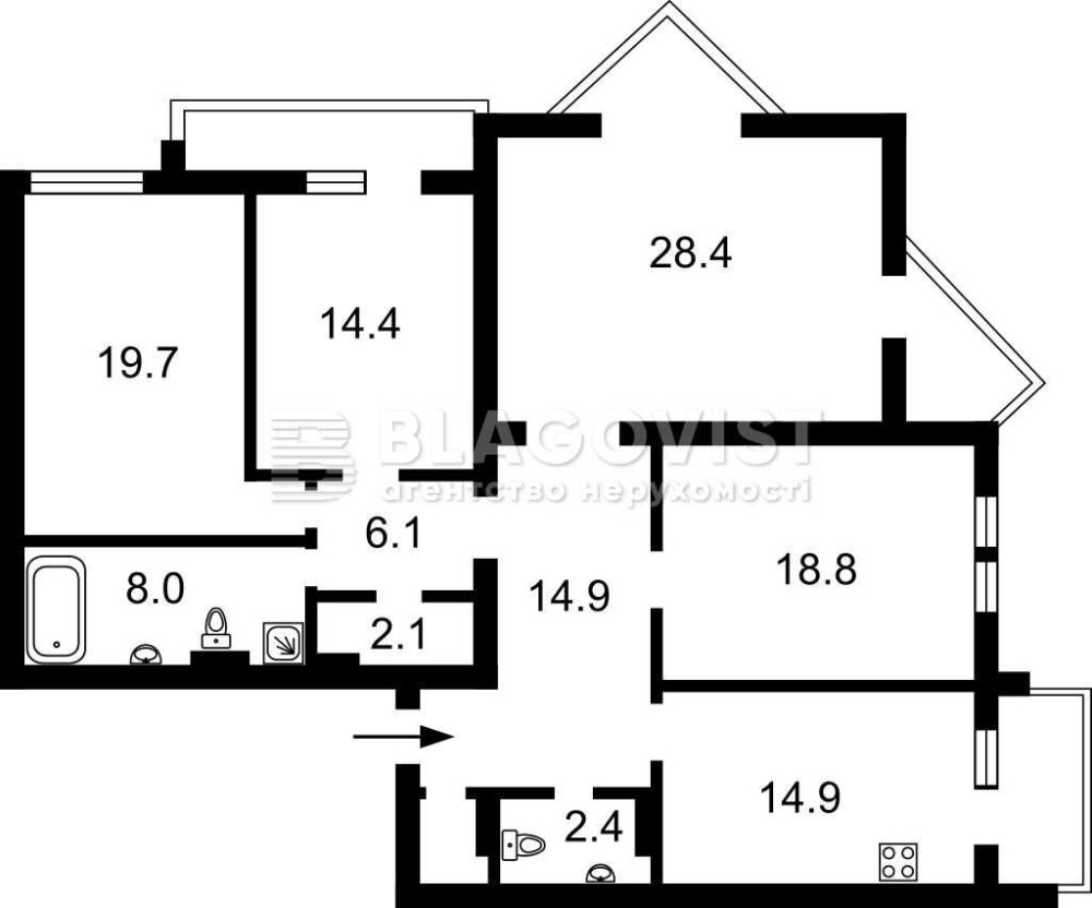 • Площадь кухни 14.9 м2