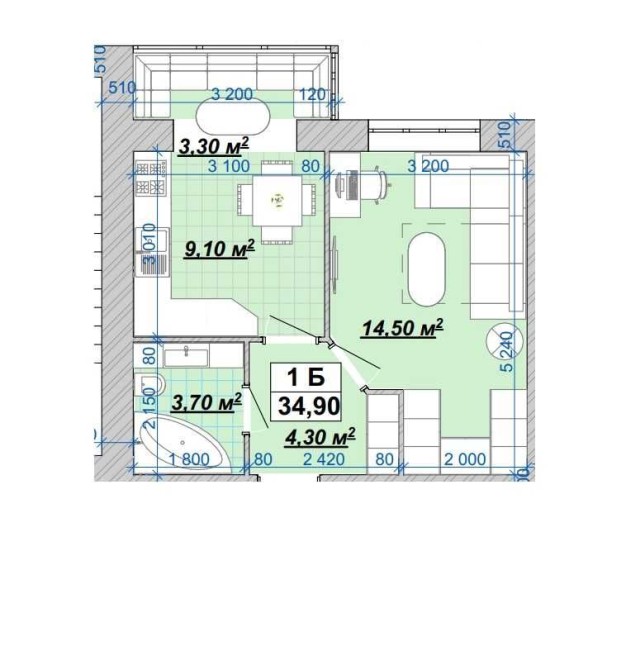 • Общая площадь 34.9 м2