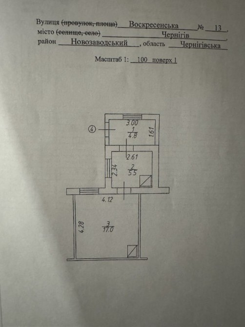 Загальна площа 28м2., Кімната 17м2., кухня 5,5 та коридор.