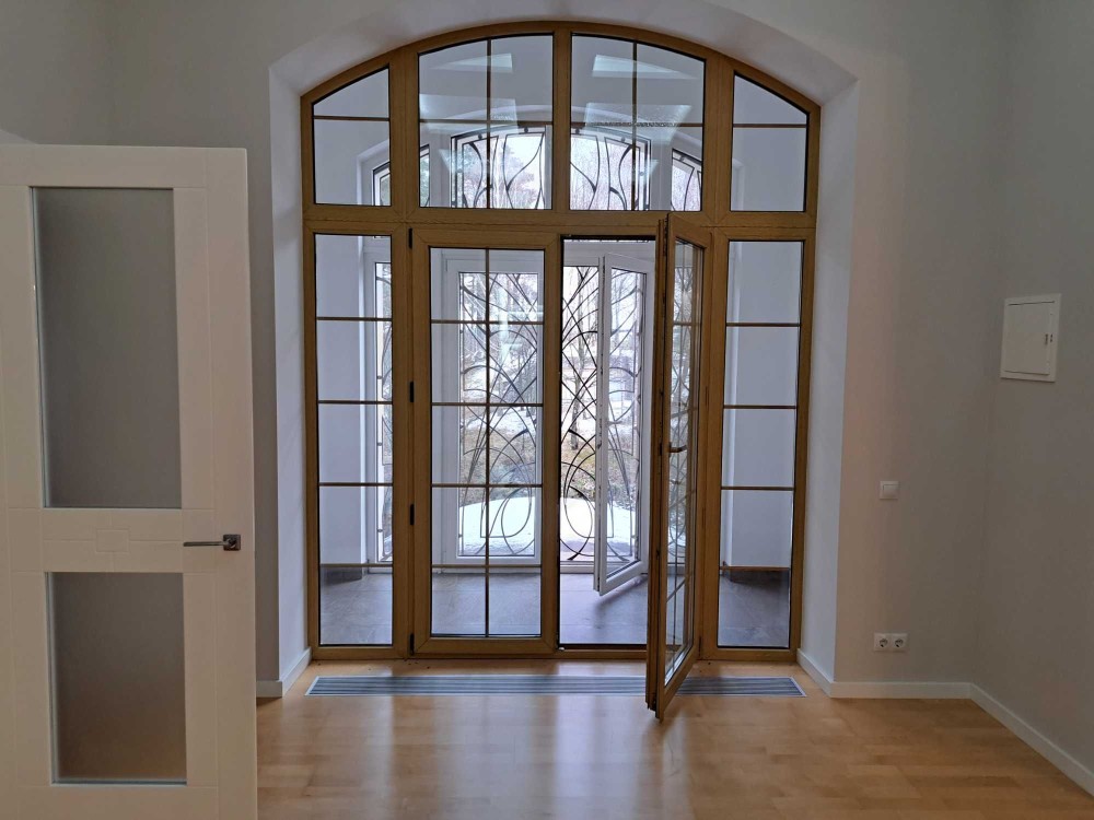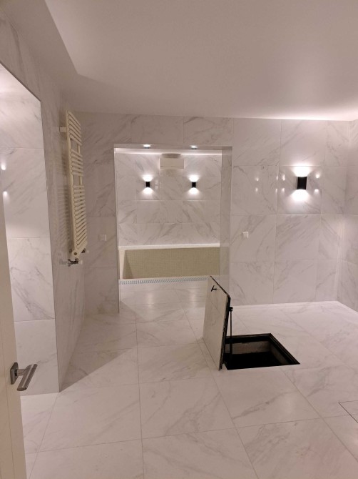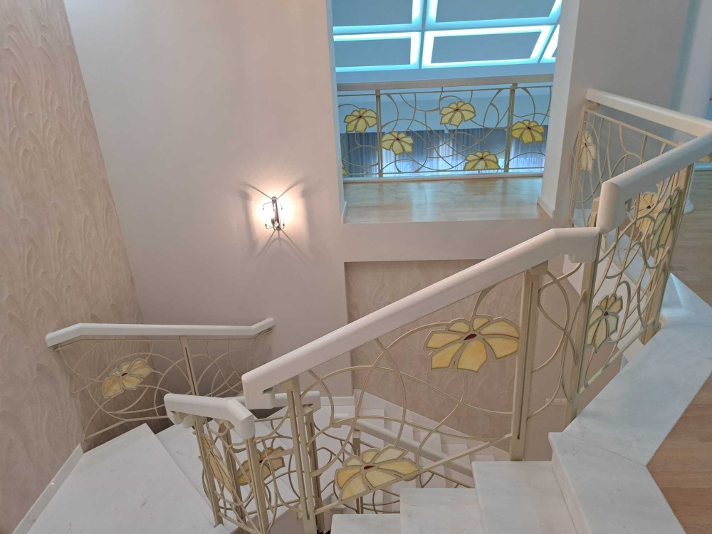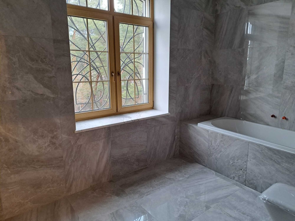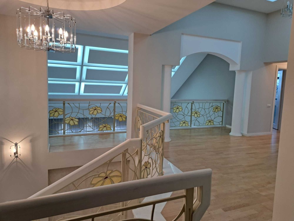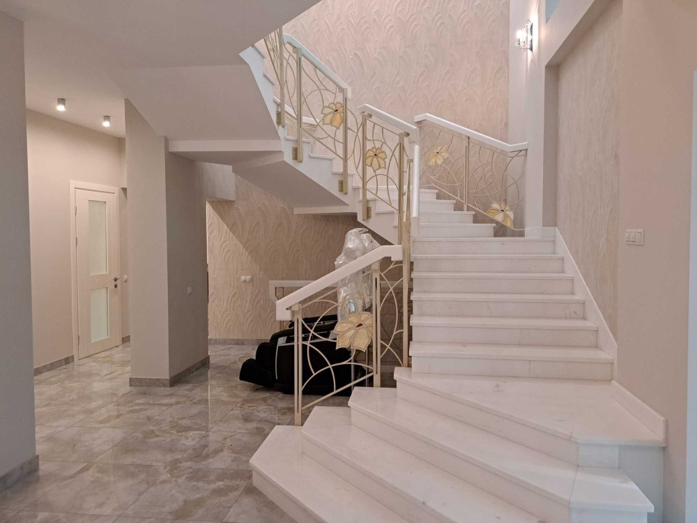 7. Сходи в будинку : білий мармур Polaris Medium , плитка торгових марок : Peronda , La Faenza , Imola . Паркет виробництво BOEN Німеччина. Підвіконня : мармур Crema Marfil Іспанія.