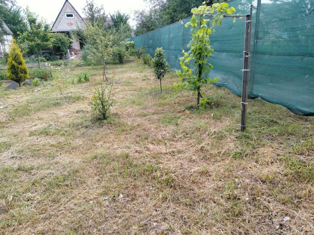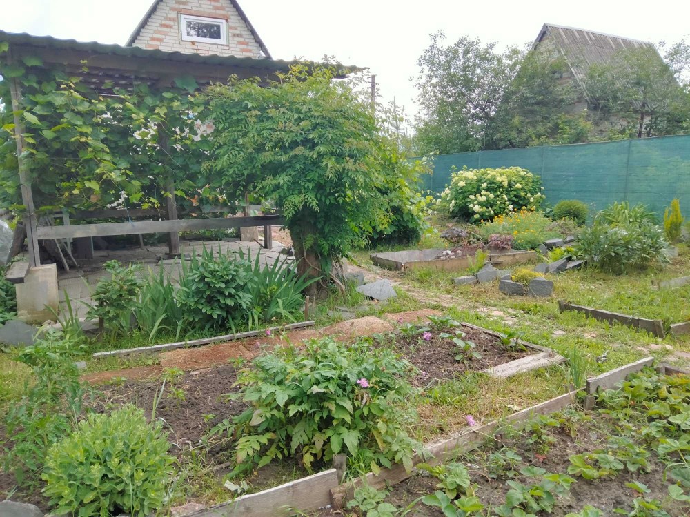Благоустрій дачі під відпочинок, декоративна зона та декілька земельних грядок, молоді фруктові дерева.