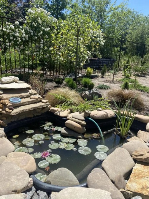 На участке декоративный водоем с водопадом и нимфеями