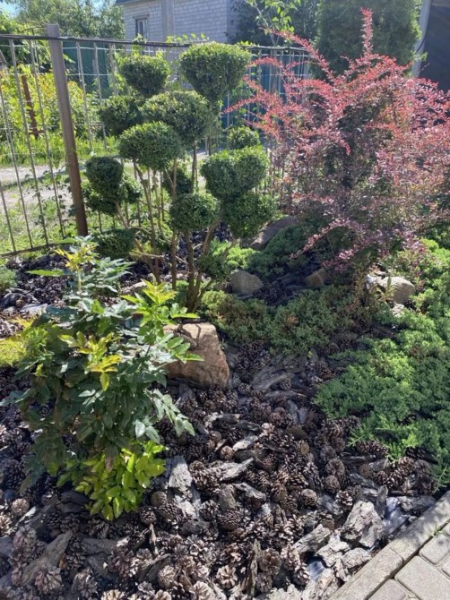Засажен газоном, туями, елями, барбарисом, можжевельниками и сортовыми яблонями