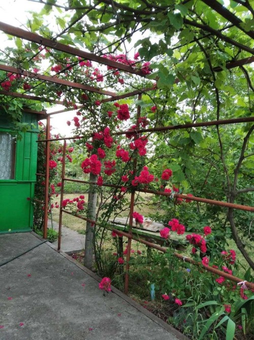Площа 12,5 м². Є стіл, диван, меблі. Веранда ззовні обплетена трояндами, виглядає казково!