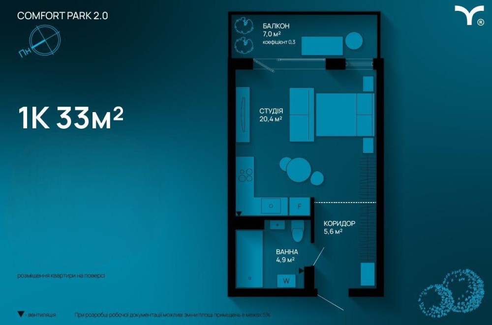 • Общая площадь 33 м2
