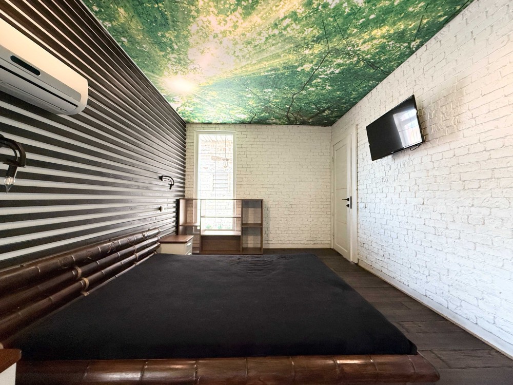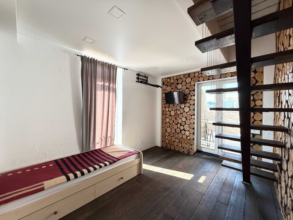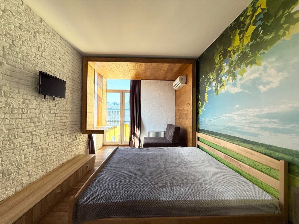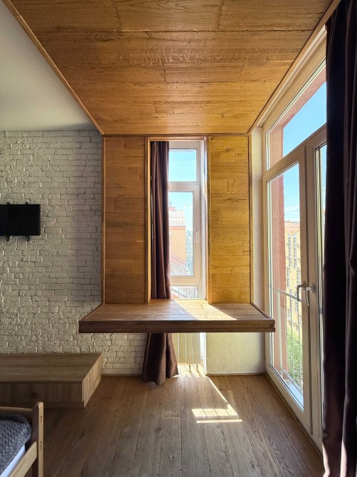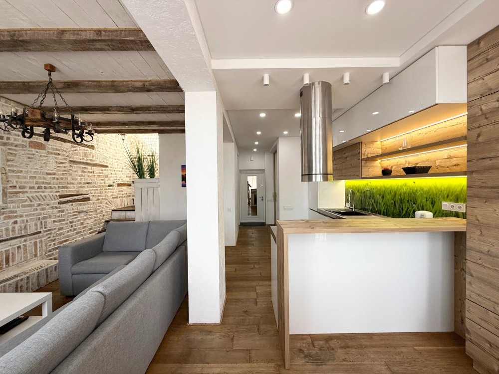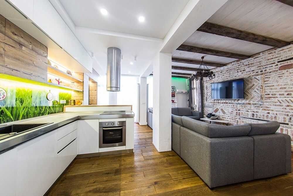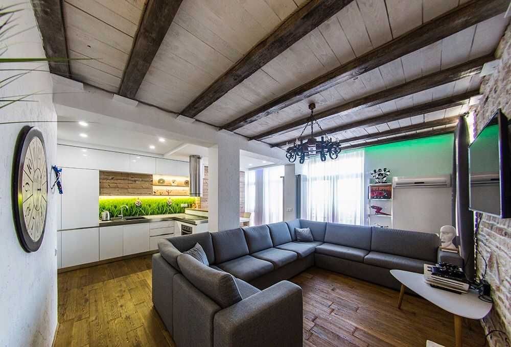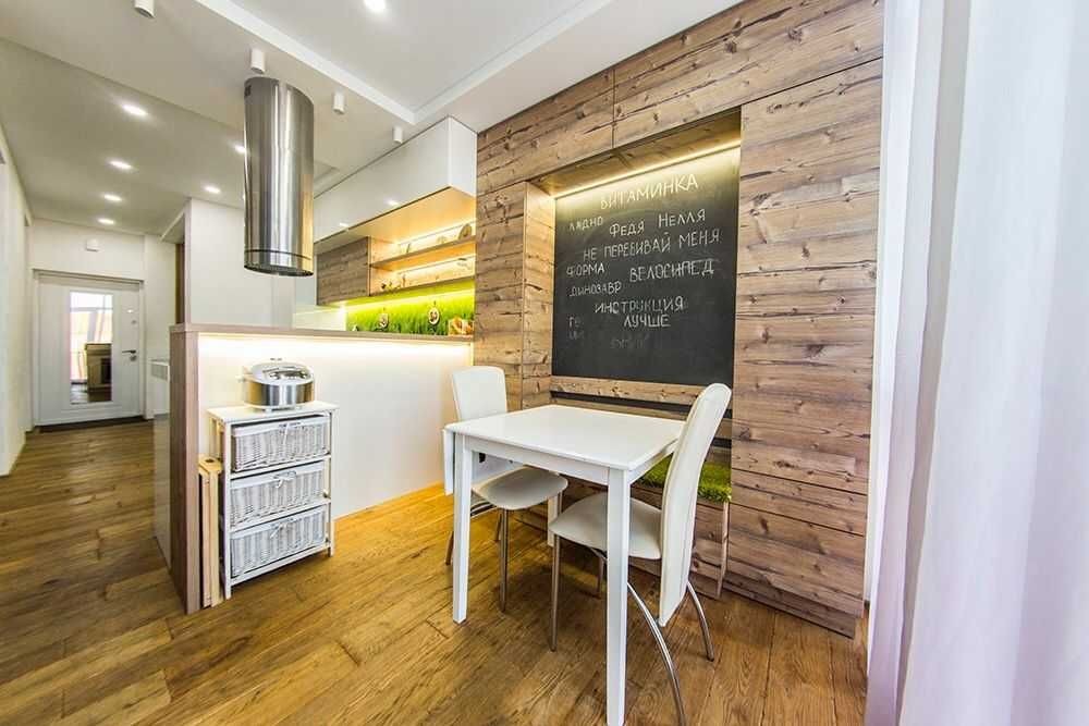 Ремонт виконаний за індивідуальним дизайнерським проектом, з використанням екологічних матеріалів, підлога - натуральне дерево, стіни - цегла під лофт і зруб.