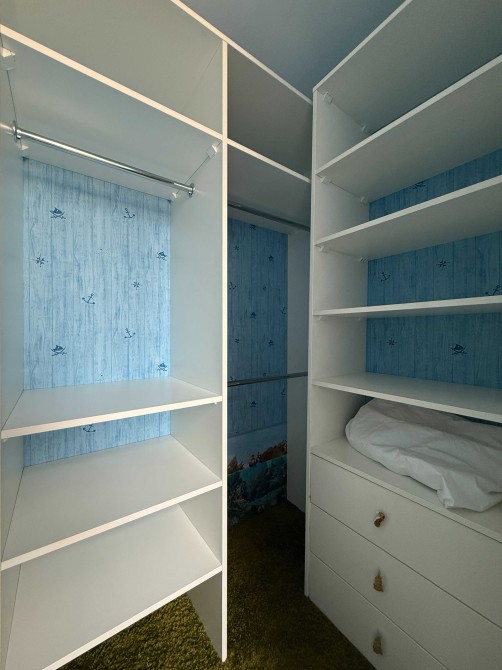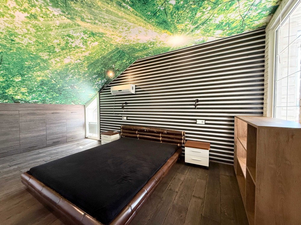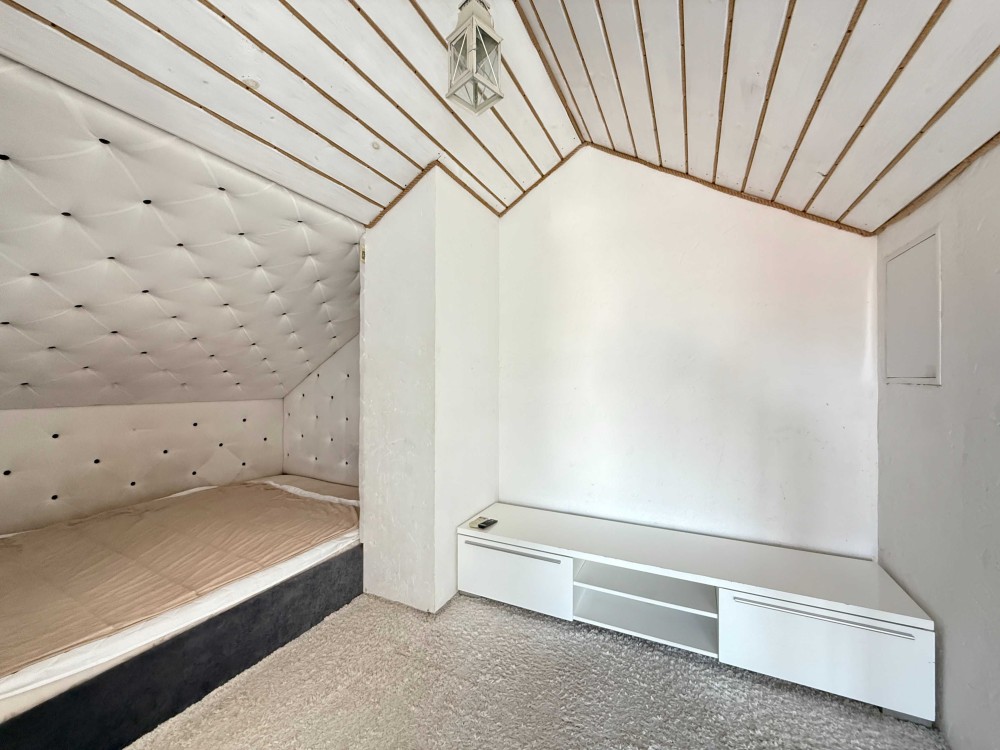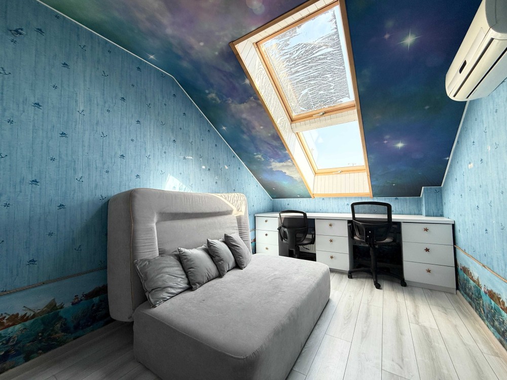 Третій рівень – мансарда з ще одним двоспальним ліжком, комора-гардероб під скошеним дахом, третій санвузол з дальньою коморою.