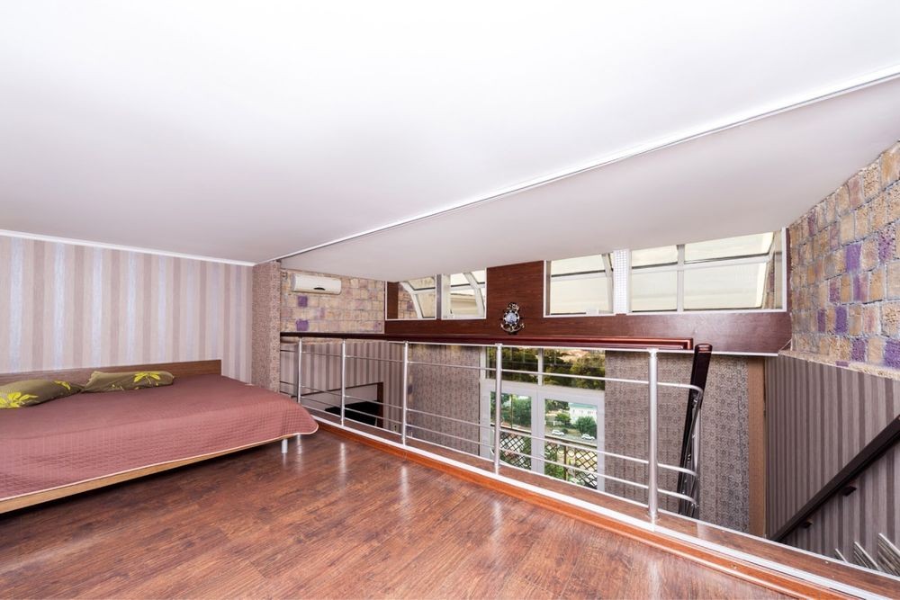 Квартира в 2 уровня, состоит из просторной комнаты – студии с раскладным диваном, которая объединена с кухней и обеденной зоной; удобная лестница ведет на второй уровень с двуспальной кроватью, оснащенной качественным ортопедическим матрасом. в прихожей и спальне встроенные шкафы-купе+есть гардеробная у входа, оснащена санузлом с ванной /душем, панорамное остекление позволяет любоваться морским пейзажем.