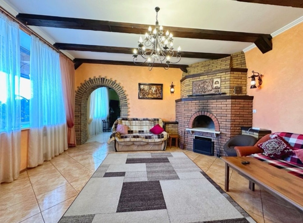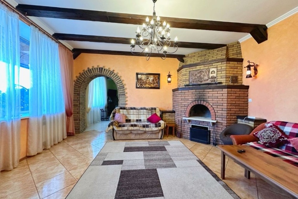 Кухня студия , 5 спальных комнат,холл с диваном,камин, печь.