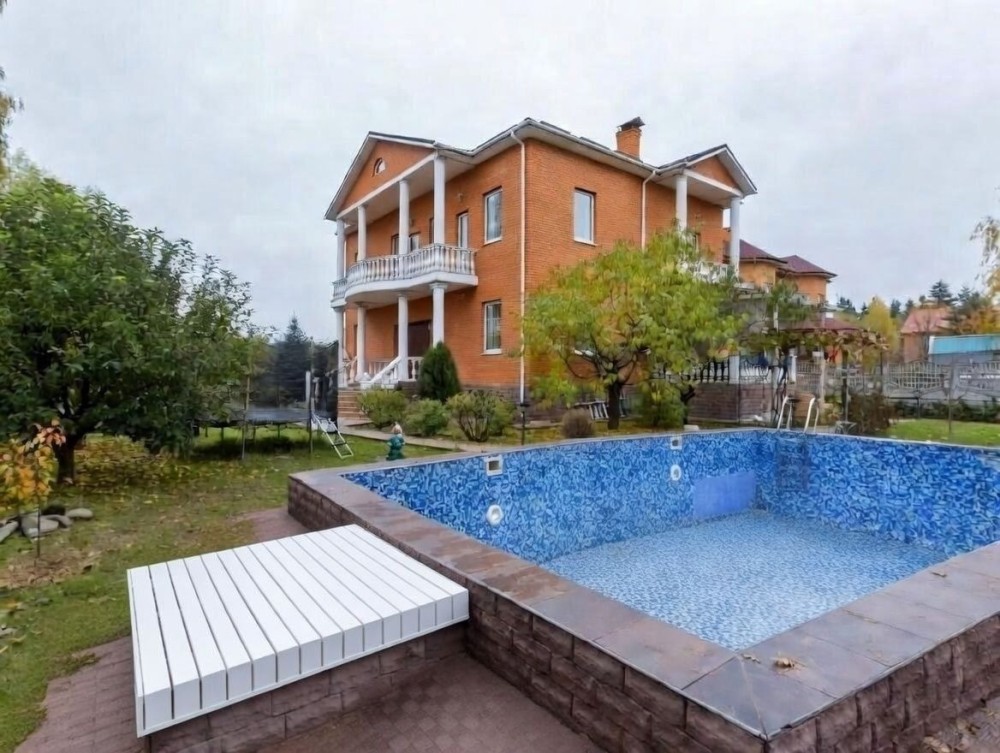 Цегляний будинок у найближчому передмісті Києва. Київська реєстрація. 4 км. до ст. М "Житомирська". Усі комунікації заведено до будинку. Каналізація централізована. Вода – свердловина. Басейн 10 м на 6 м. Гараж на 1 автомобіль, ворота механічні. Асфальтована вулиця. Закрита територія. В'їзд за перепустками.