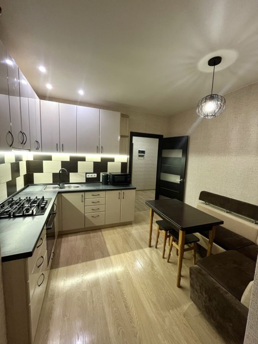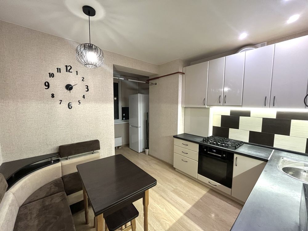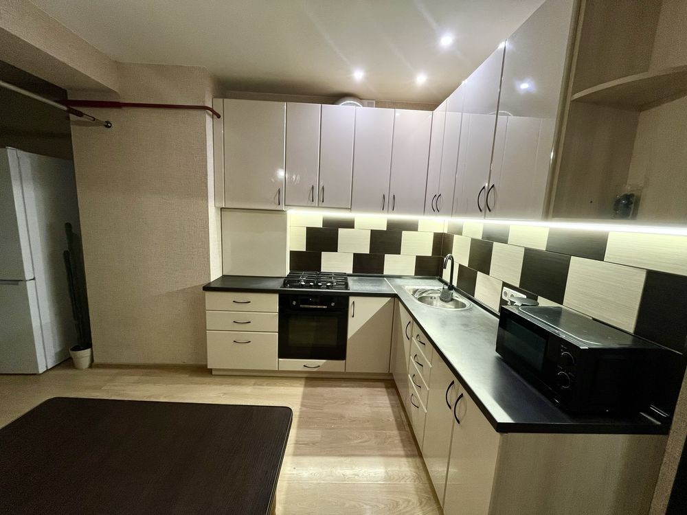 У квартирі є всі необхідні меблі та техніка: диван, тумба під ТВ, велика шафа-купе, кухонний гарнітур, розкладний кутовий диван, стіл і стільці.