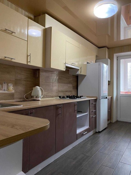Укомплектована меблями та технікою (газова плита, витяжка, мікрохвильова піч, холодильник, електрочайник, пральна машина, телевізор).