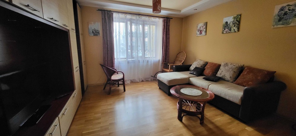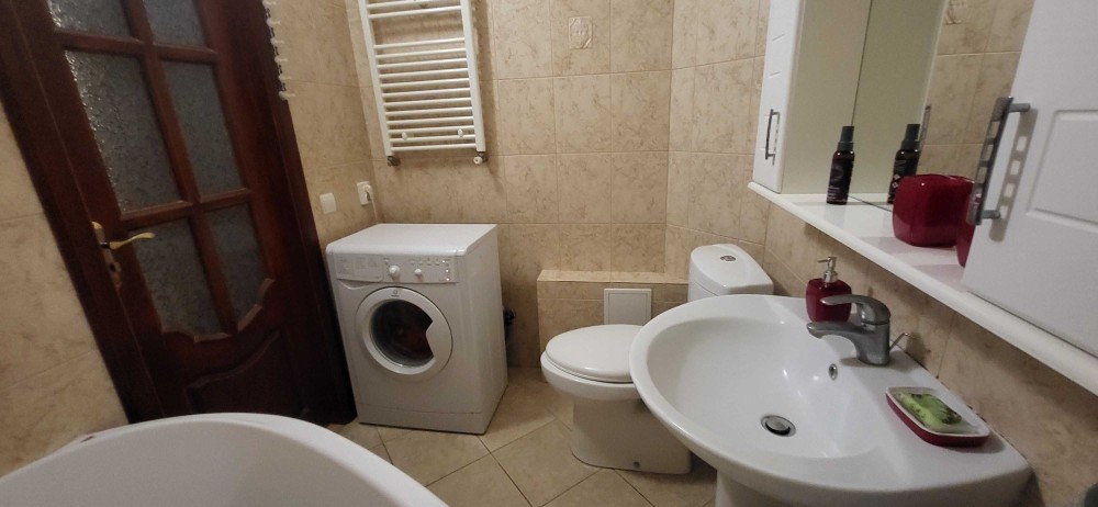 Є два балкони які виходять у внутрішній двір , де є дитяча площадка. Квартира повністю облаштована меблями.