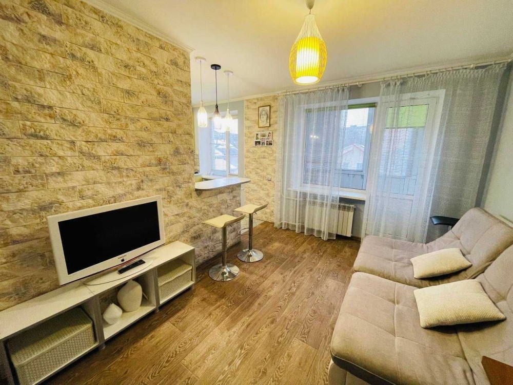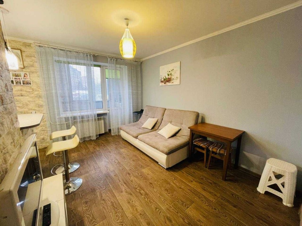 Власники облаштували у квартирі окрему кімнату та простру кухню-вітальню, також окремо є гардеробна кімната. У квартирі є усе необхідне, Вам точно тут буде затишно та тепло.