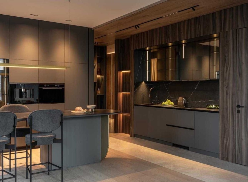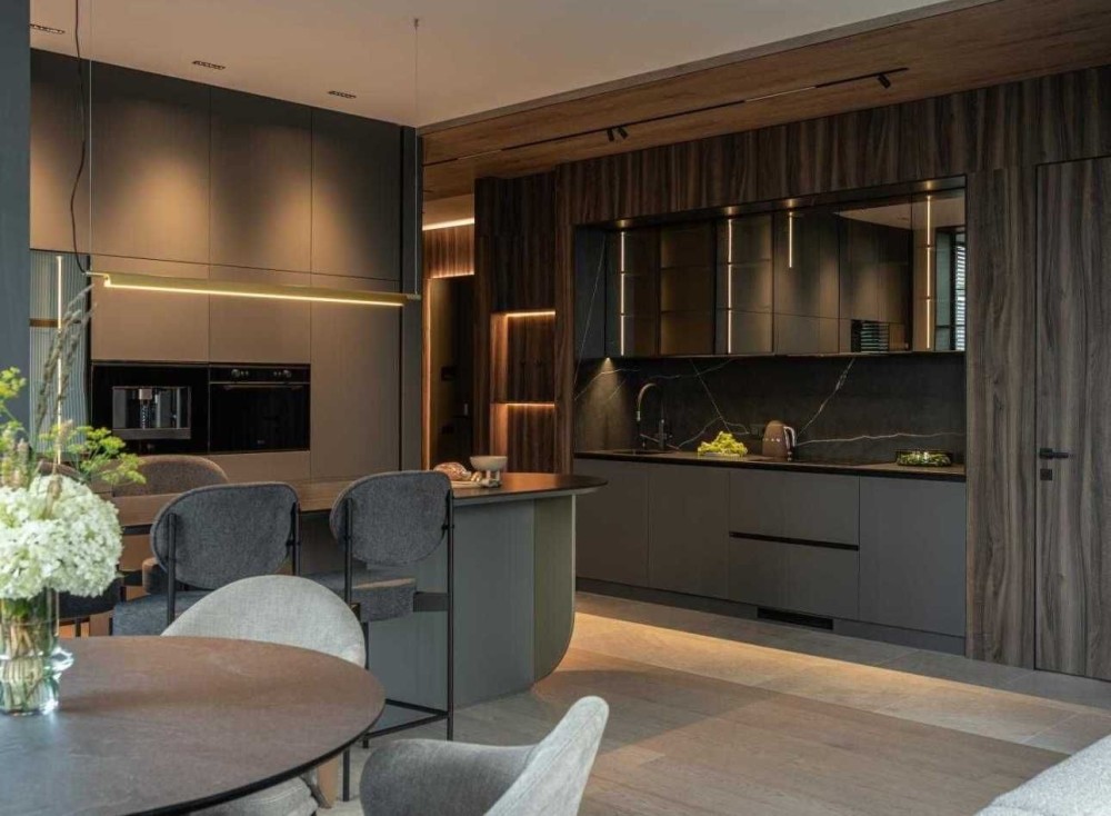 Кухня з величезними зонами зберігання, великим островом та безліччю вбудованих шаф.