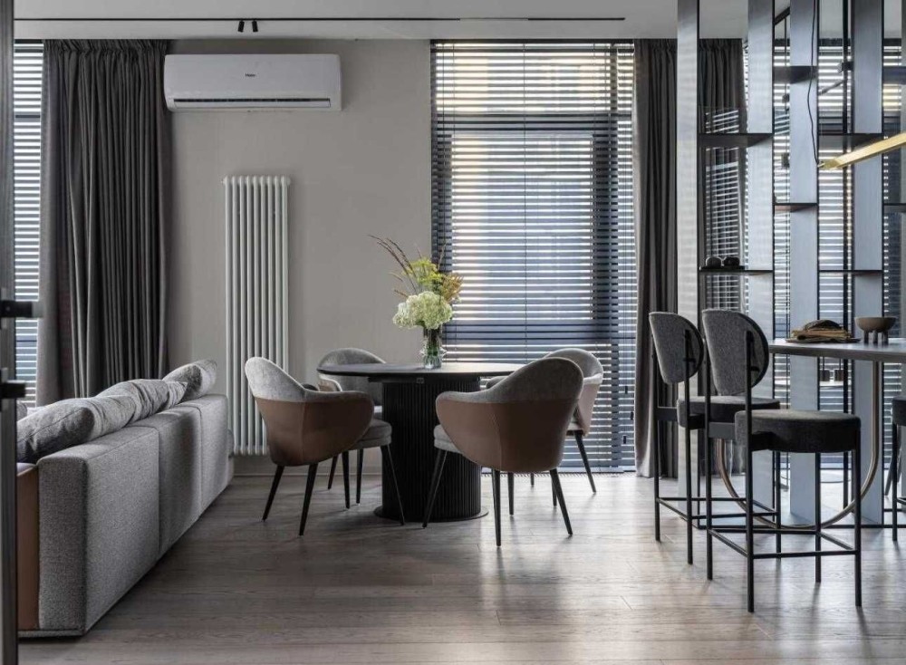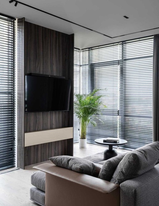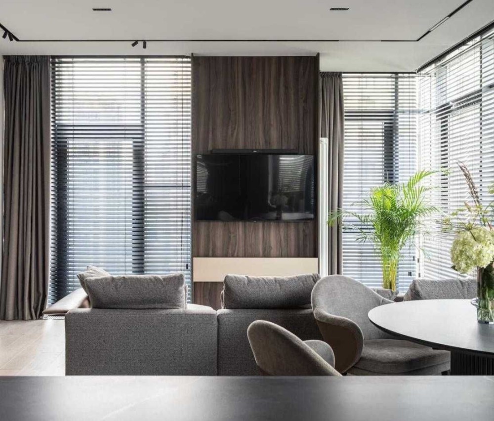 Всі вікна вітальні, кухні-їдальні та балкона оснащені дерев'яними жалюзі з широкою планкою. Управлінням шторами.