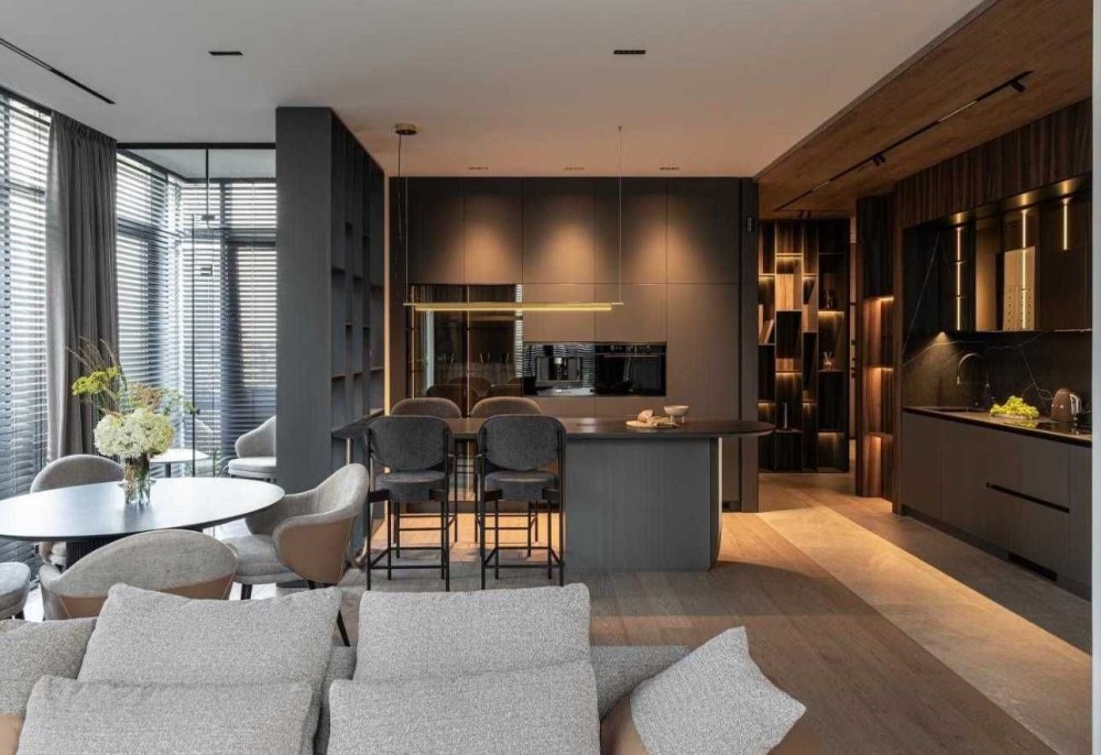 Зона вітальні розташована таким чином, що розміщення ТБ дає можливість дивитися його з будь-якої точки простору, чи то з острова їдальні.