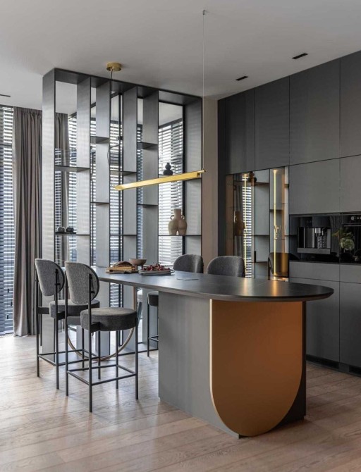Скляна вітрина поруч із островом, полиці, суміжні зі скляною перегородкою балкона.