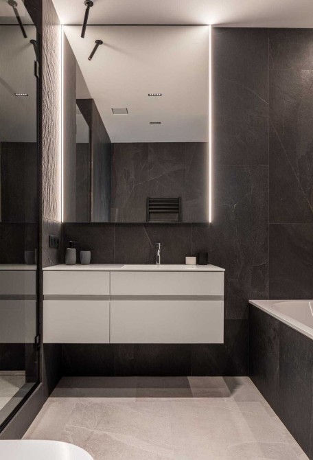 Телевізор, туалетний столик-дзеркалом та відкидною скринькою для зберігання прикрас та косметики. Зручне планування гардеробу при спальні з великим вертикальним дзеркалом з підсвічуванням прямо на вході в гардероб.