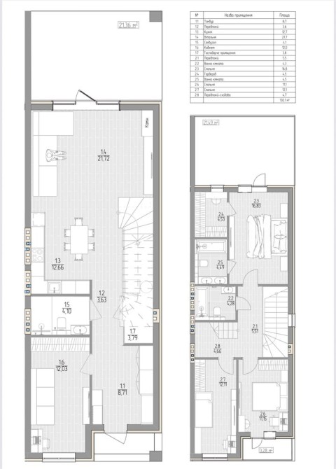 Дуплекс, 2 поверхи + 1 мансарда, площею 145 м2 + 2 тераси по 21 м2 кожна, разом 170 м2
