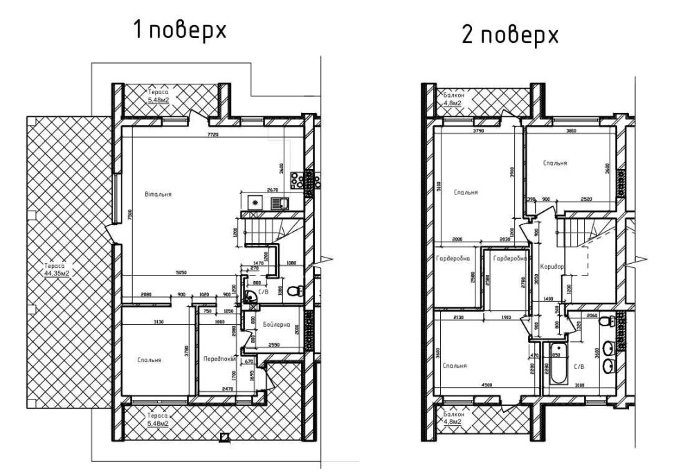 Планування функціональне та зручне для сім’ї. На першому поверсі — вхідна група, котельня, окрема кімната, гостьовий санвузол та простора кухня-вітальня з виходом у двір. На другому — батьківська спальня з нішею під гардероб і балконом, ще дві окремі кімнати (одна з балконом) та санвузол.