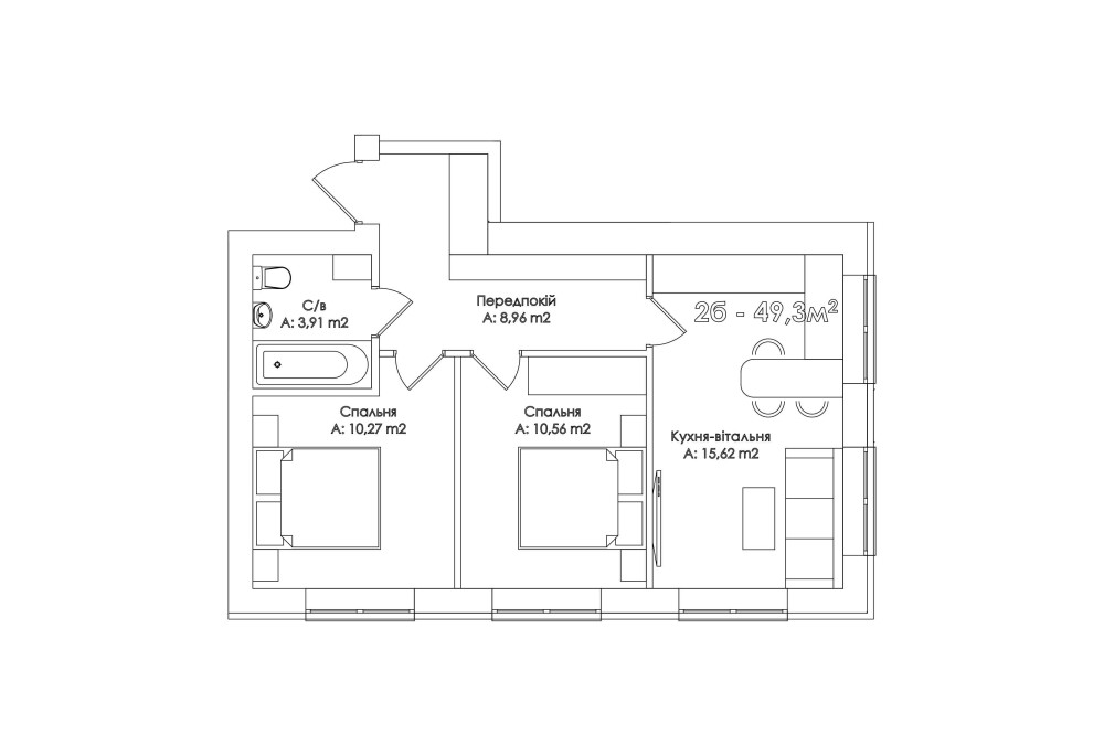 В квартирі дві кімнати по 10,5 кв.м., кухня студія з трьома вікнами, дуже світла та простора, функціональний коридор із продуманими місцями для розміщення двох великих шаф.