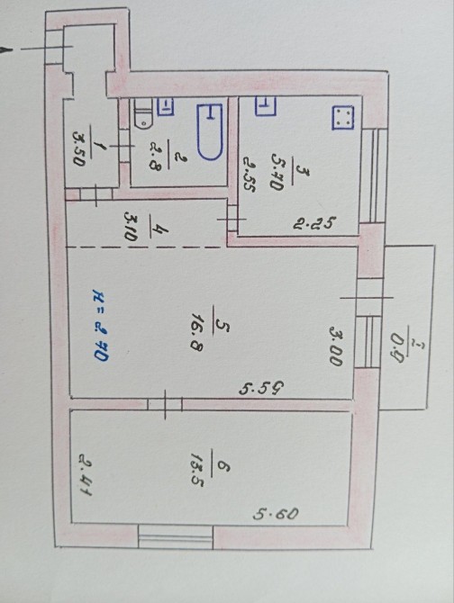 • Площадь кухни 6 м2